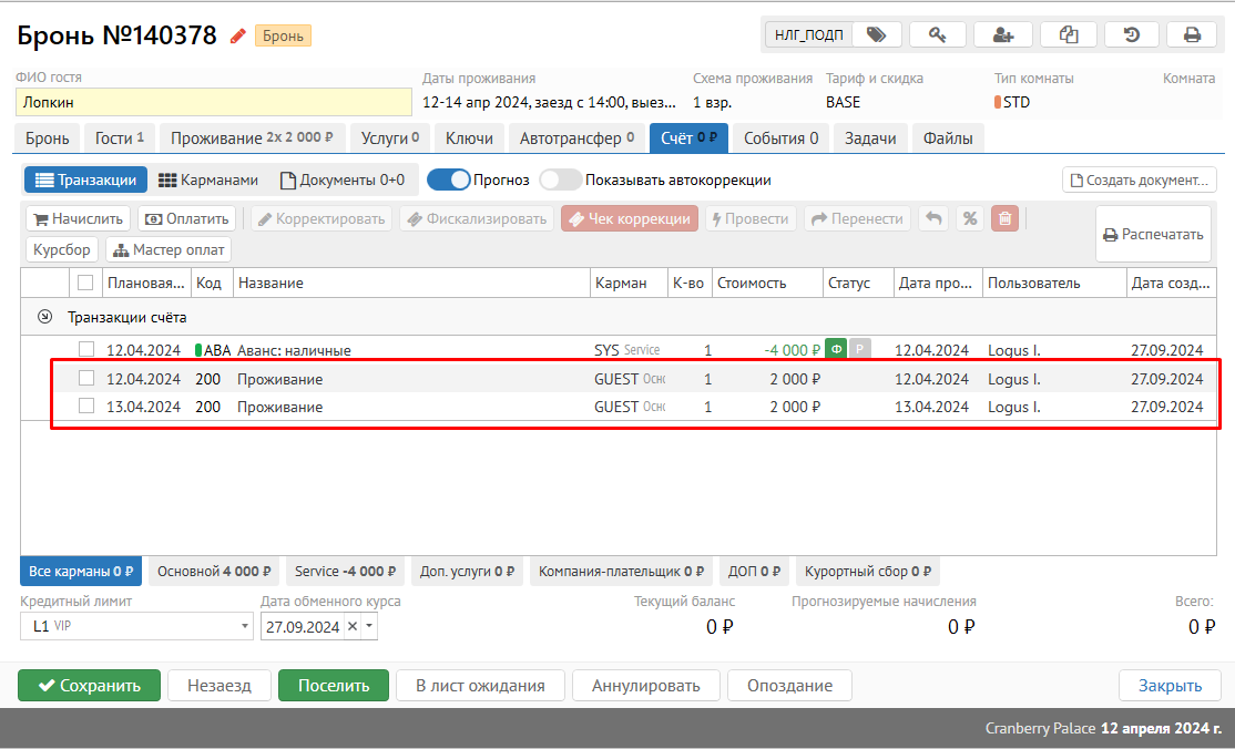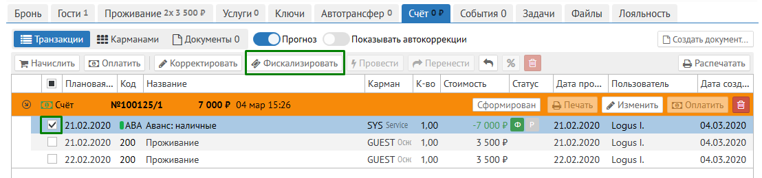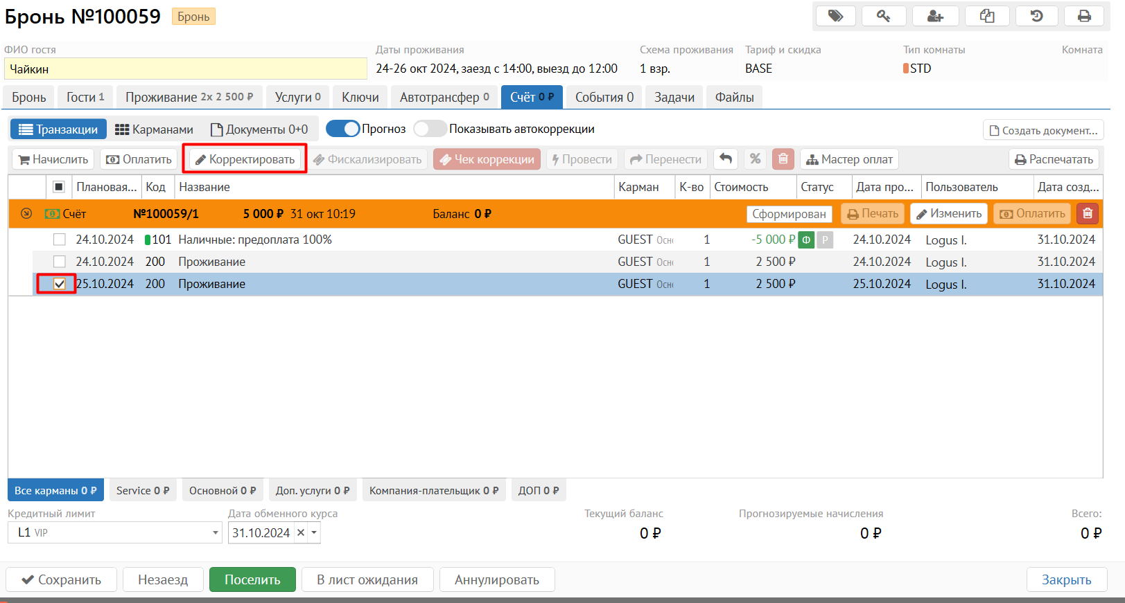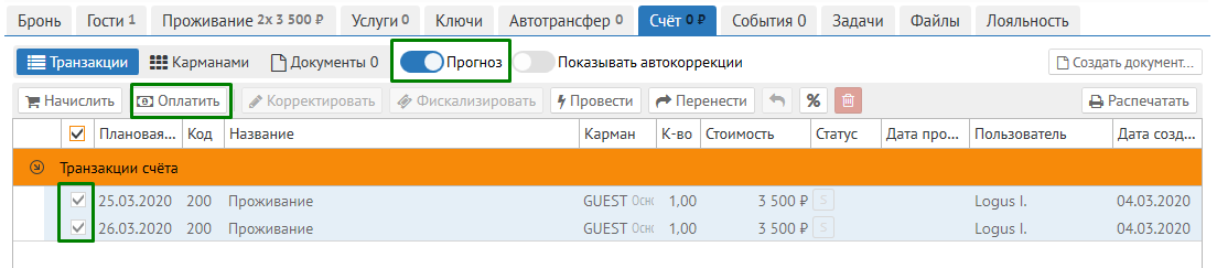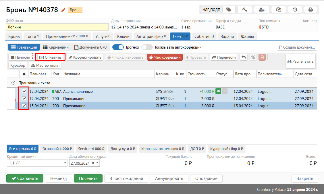 - Выбрать счет для трансфера аванса (например профиль гостя)