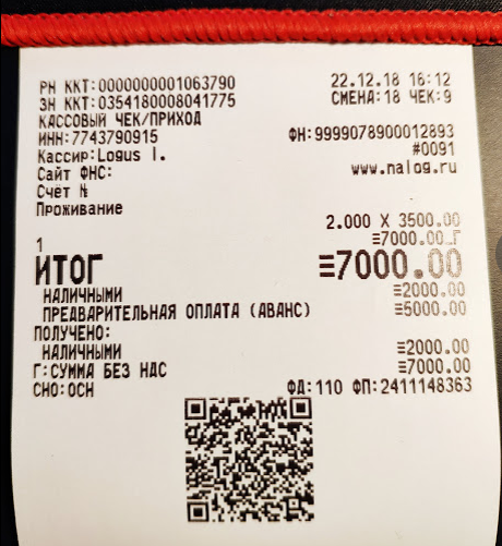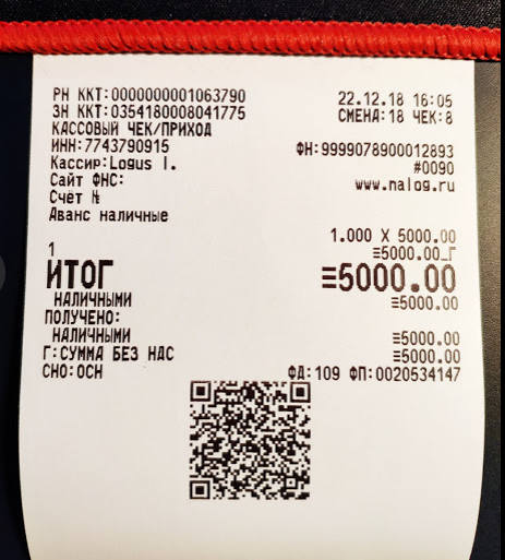 Как видно из примера выше, обе транзакции аванса (3000 и -10000) были просуммированы в чеке, так как имеют один тип оплаты (аванс) и НДС.