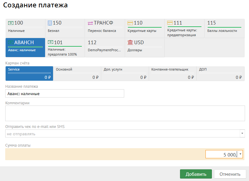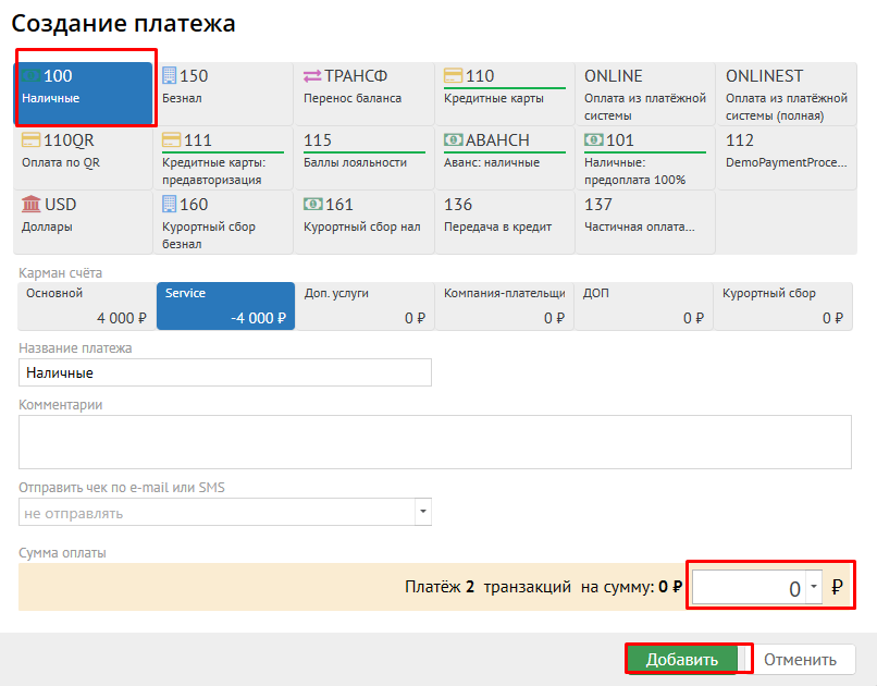 - Выбираем способ оплаты "Наличные" и добавляем платёж.