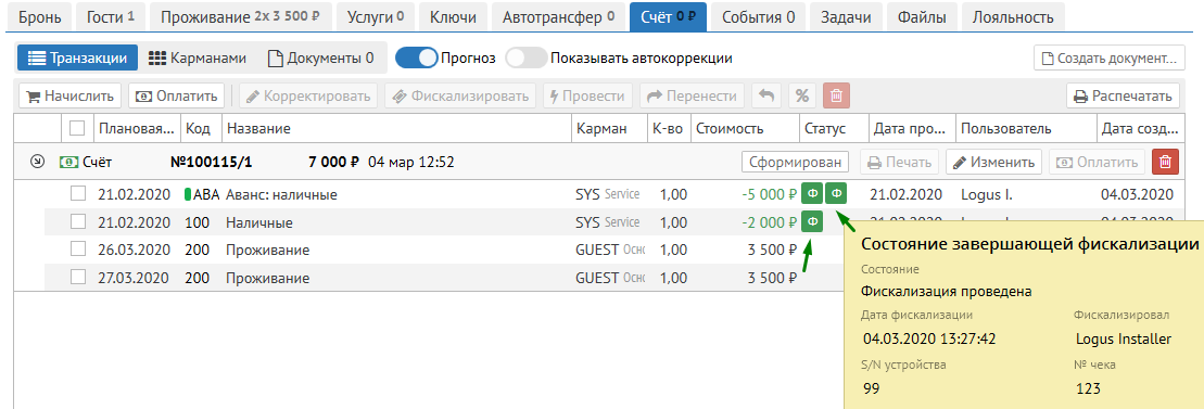 В результате будет сформирован документ-чек, в котором будут услуги и 2 транзакции оплаты - авансовая на 5000 рублей и наличная на 2000.