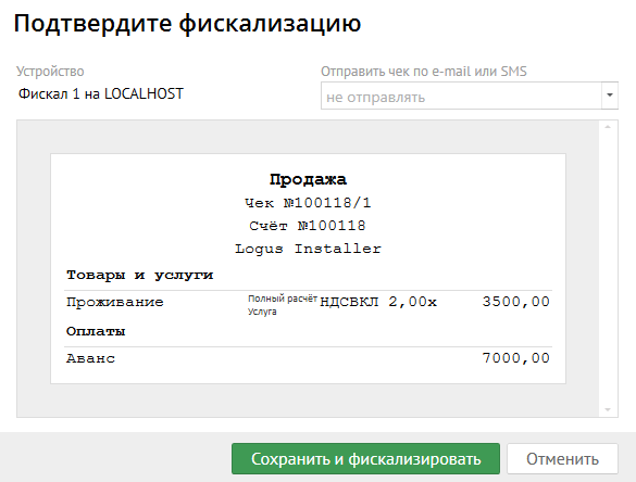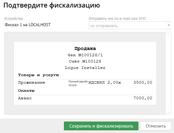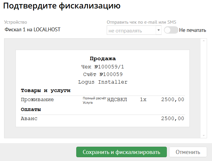 Перед печатью чека убедитесь, что позиции чека имеют правильный признак (товар/услуга). Так же в чеке устанавливается Признак способа расчёта - "Полный расчёт", Признак предмета расчёта - "Услуга". В разделе Оплаты указан взятый нами ранее Аванс и сумма взятая сейчас. Нажимаем "Сохранить и фискализировать".
