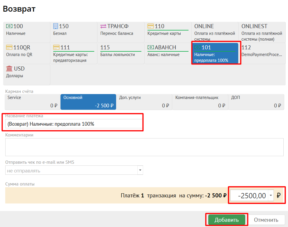 - В "Сумма оплаты" вводим отрицательную сумму (на сумму возврата)