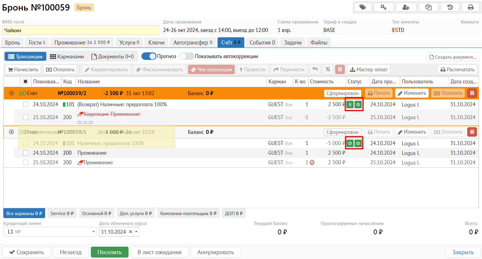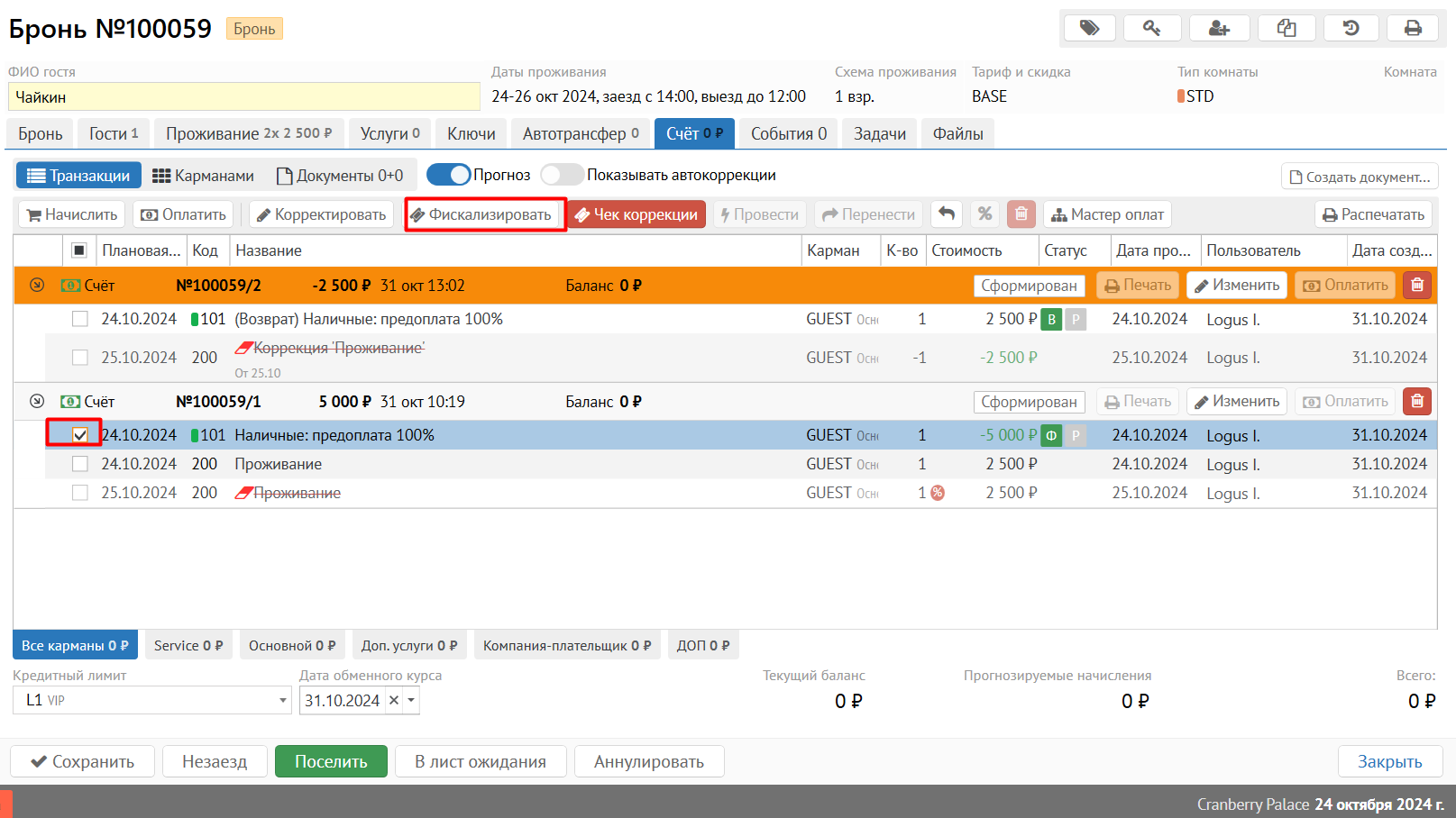 2. Коррекции услуг на возврат появятся вне финансового документа. Необходимо выделить коррекции и нажать Оплатить: