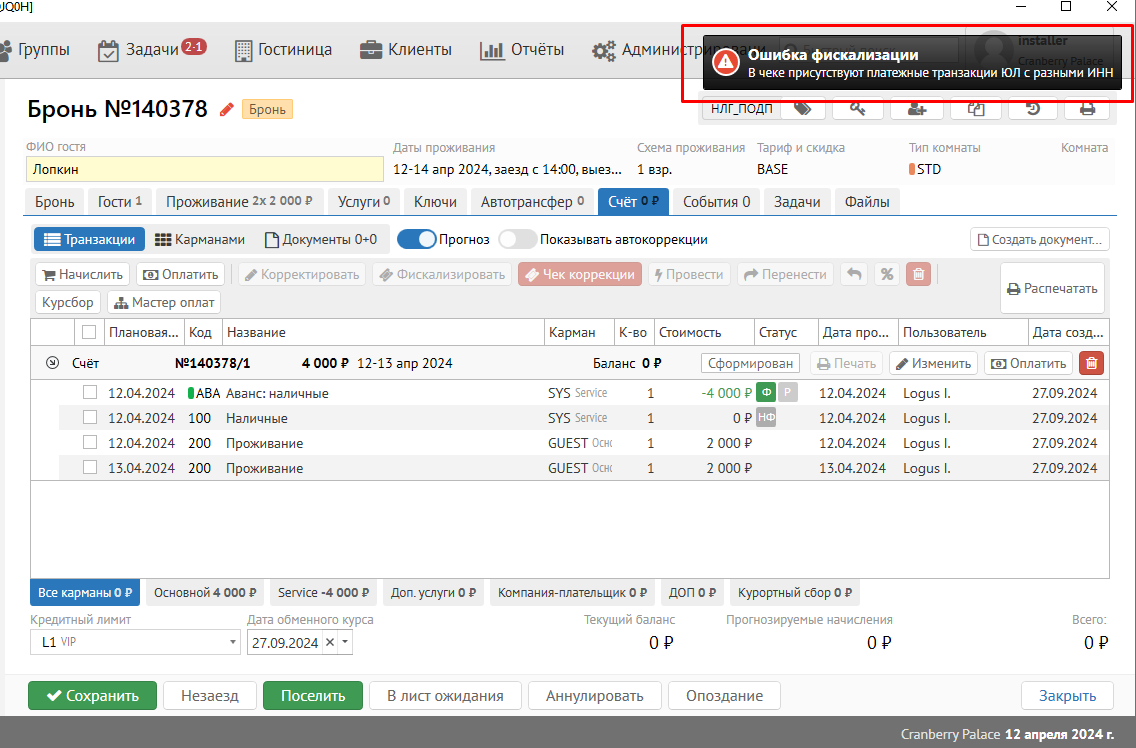 При выезде гостя Предоплату необходимо повторно фискализировать.