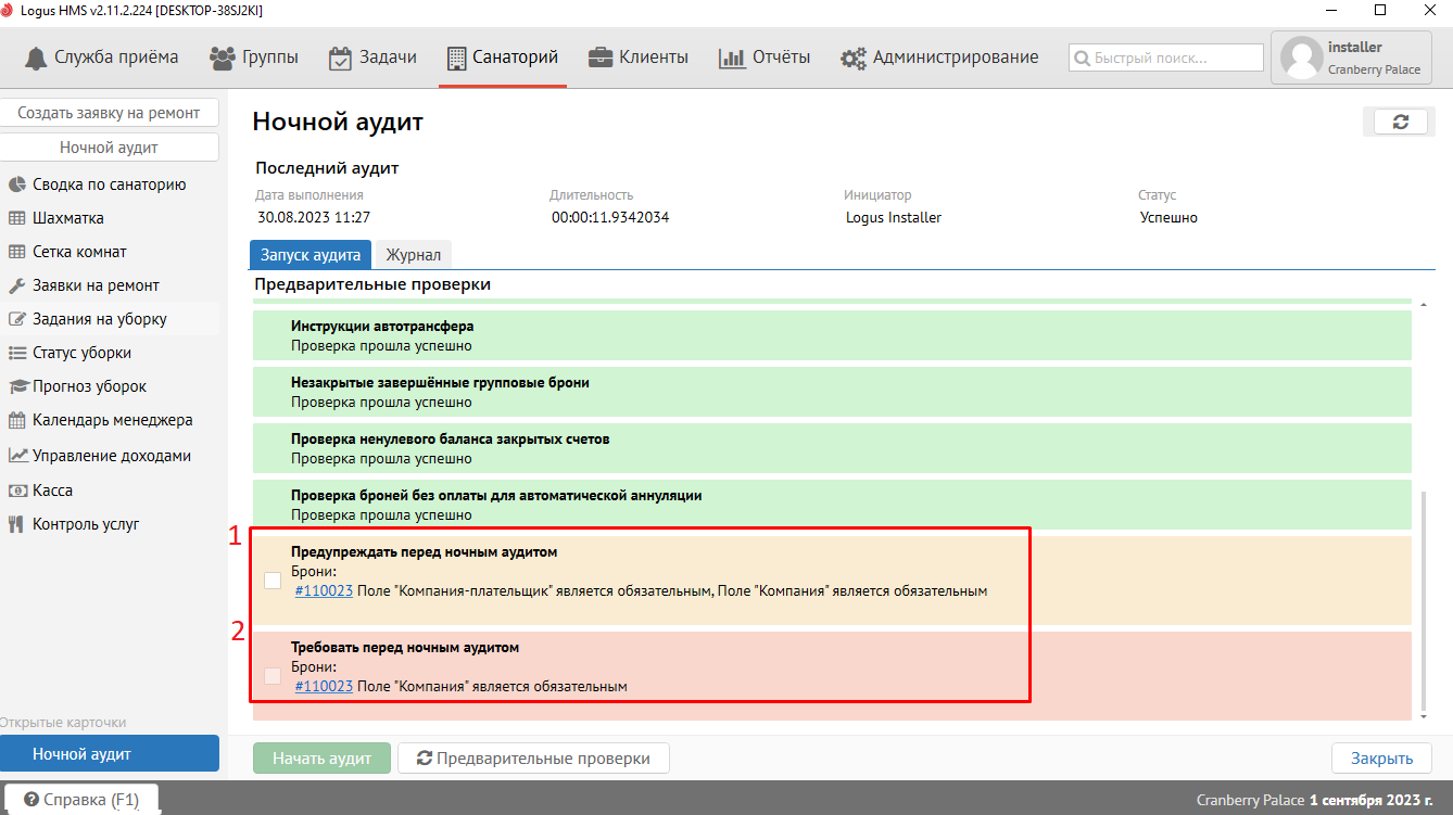 Функция закрывает следующие потребности клиента: Исключение ручной сверки — система автоматически проверяет все условия перед закрытием дня. Предотвращение финансовых ошибок — блокирует аудит при наличии незакрытых счетов, разделённых оплат или непроведённые комиссии. Автоматизация операционных процессов — запускает назначение уборок, обработку выселений, обновление статусов номеров без участия человека. Сбор статистической информации — актуализирует данные для последующего использования в отчётности. Проверка заполнения необходимых полей — не позволяет завершить день, если в бронях отсутствуют критически важные данные (например, данные гостя, категория номера или компания), предотвращая ошибки в отчётности и расчётах (с версии 2.9.119). Для начала работы с функцией ночного аудита пользователю необходимо зайти в «Гостиница/Санаторий» → «Ночной аудит» Корректное проведение ночного аудита возможно после выполнения предварительных проверок. Для этого пользователю необходимо нажать на соответствующую кнопку: Система отобразит список параметров с цветовой индикацией статусов: 🟢 Зелёный — проверка пройдена успешно. 🟡 Жёлтый — предупреждение. Для согласия с автоматическими изменениями системы установите галочку в соответствующем поле. 🔴 Красный — ошибка, блокирующая проведение аудита. Требует обязательного исправления. 🔵 Синий — информационный запрос. Проведение аудита возможно как с установкой галочки, так и без неё. Для каждого параметра с ошибкой или предупреждением будет показана рекомендация по исправлению. Аудит не будет произведен, пока все ошибки (красные пункты) не будут устранены. После исправления ошибок можно повторно выполнить предварительные проверки, чтобы убедиться в корректности всех данных. Эта функция подскажет, всё ли было исправлено, и подсветит оставшиеся проблемы. Если все проверки пройдены, то после предварительных проверок все поля окрасятся в зелёный. В проверках допускается наличие голубого или жёлтых пунктов. Для жёлтых пунктов (предупреждения) обязательно либо ручное изменение, либо установка галочки для согласия с автоматическими действиями системы. Для синих пунктов (запросы) установка флажка необязательна. Для запуска ночного аудита пользователю необходимо нажать соответствующую кнопку: Система инициирует запуск ночного аудита, в этот момент всем активным пользователям системы отобразится соответствующее уведомление: При успешном выполнении ночного аудита: Историю проведения ночных аудитов можно посмотреть во вкладке «Журнал». Пользователю доступна возможность просмотра истории проведения ночного аудита за прошедшие дни. Иногда в процессе аудита могут возникнуть ошибки, требующие ручного вмешательства. В этом случае дата объекта будет переведена, и работа в системе может быть продолжена, но от пользователя требуется последующее завершение ночного аудита. Для быстрого поиска проблем необходимо во вкладке «Журнал» активировать параметр «Отображать только проблемные записи». После исправления ошибок, необходимо снова выполнить предварительные проверки. При успешном завершении аудита: Чтобы сотрудники, в период большой загрузки объекта, не забывали заполнять обязательные поля в бронях, которые оплачены и поселены, с версии 2.9.119 в модуле «Администриров