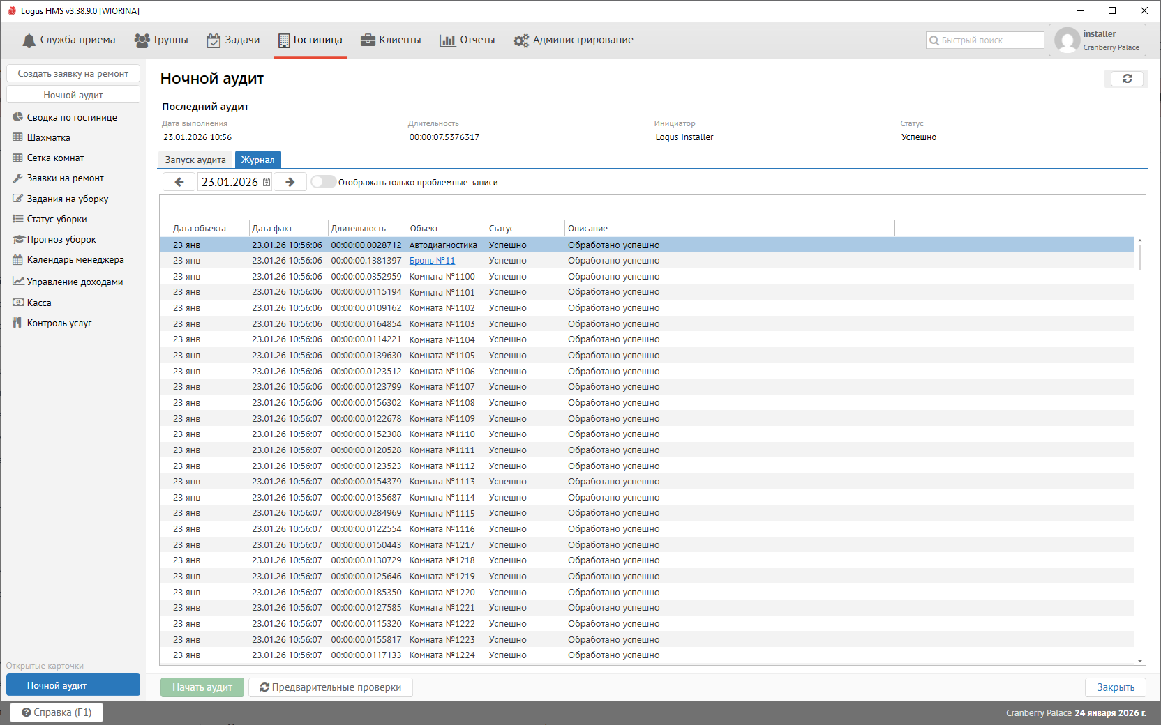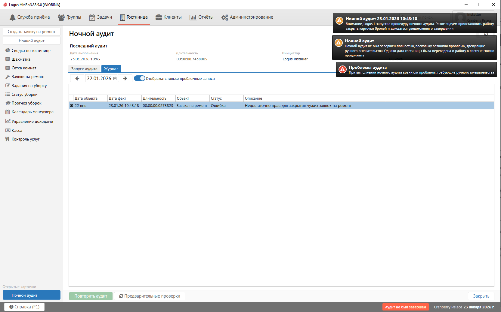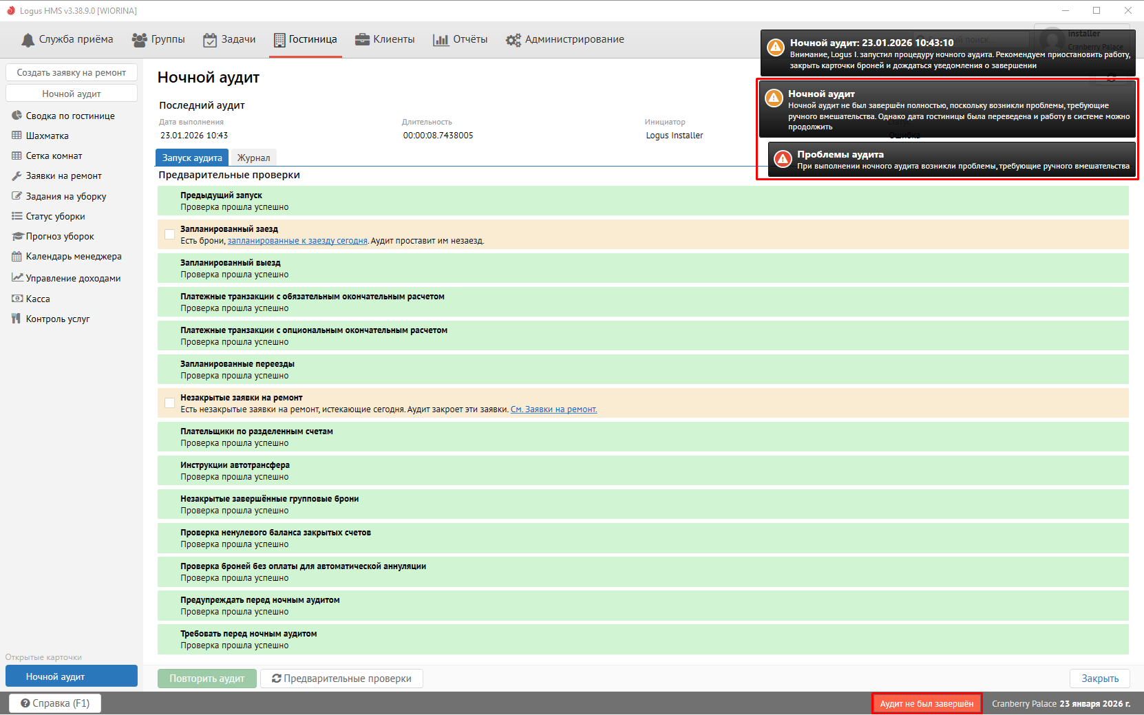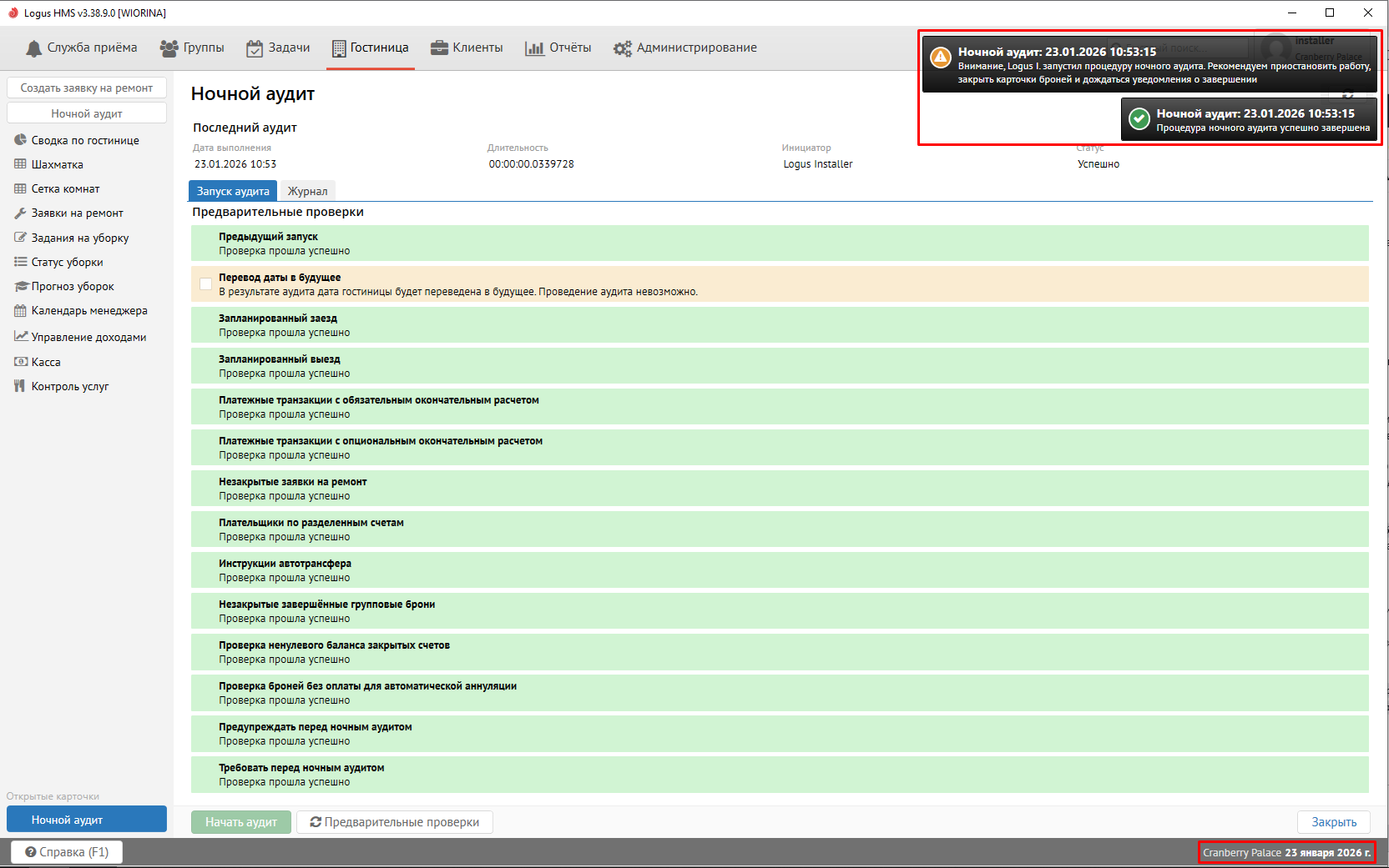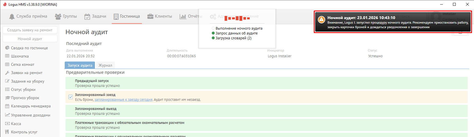 Ночной аудит — это автоматизированный процесс закрытия дня в Logus.