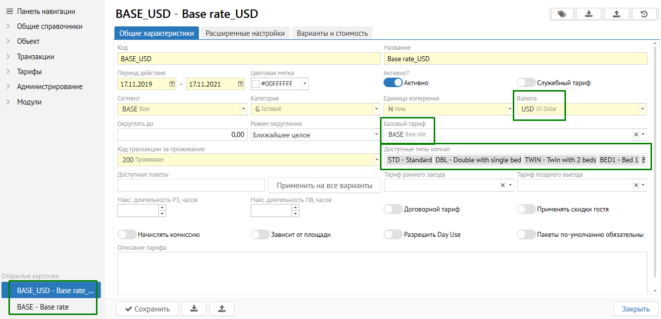 Далее надо указать обязательные параметры в соответствии с настройками базового тарифа. Кроме того, указать: Валюту (отличную от валюты базового тарифа), доступные типы комнат и доступные пакеты. Все остальные настройки будут унаследованы из базового тарифа.