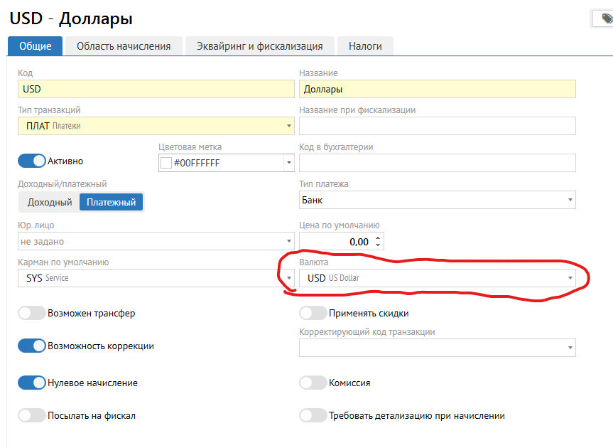 Для приёма оплат в валюте в настройки кода транзакции добавлено поле "Валюта".