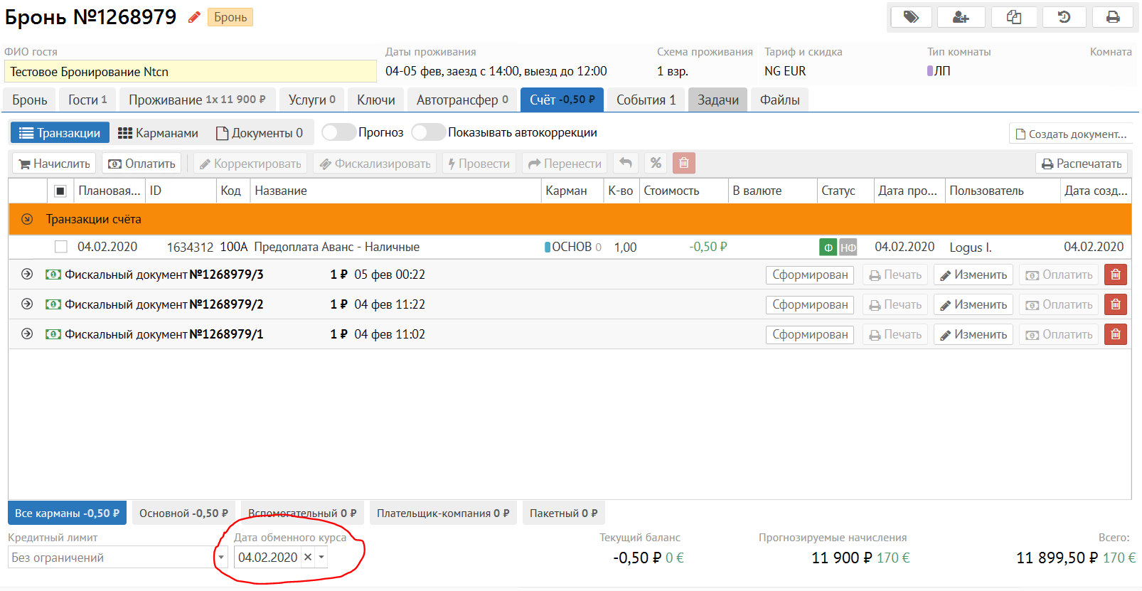 Например: Срок проживания 3 дня по 50$, всего 150$. Если гость вносит 70$ предоплаты, Логус добавит в фин.док одну транзакцию 50$ целиком, а вторую разделит на две (20$ и 30$). Транзакцию в 20$ добавит в фин.док. Таким образом гостю останется доплатить еще 80$ (целая транзакция в 50$ и отделённая часть в 30$). - У документа будет зафиксирована дата конверсии курса (по дате оплаты)