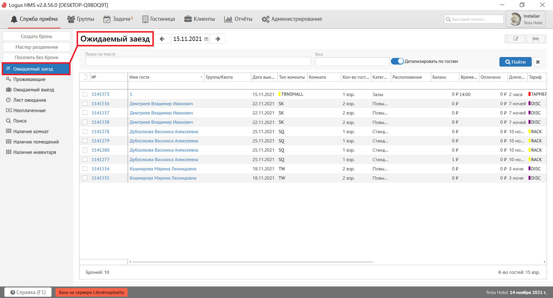 Ожидаемый заезд - перечень броней с заездом в текущую или последующие даты.
