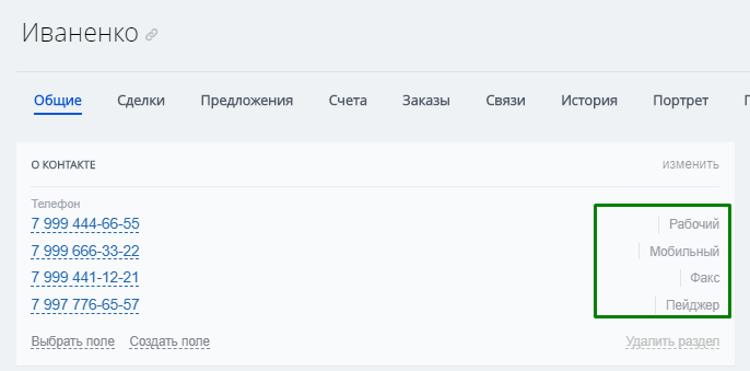 Все телефоны из Битрикс синхронизируются вместе с указанными типами.