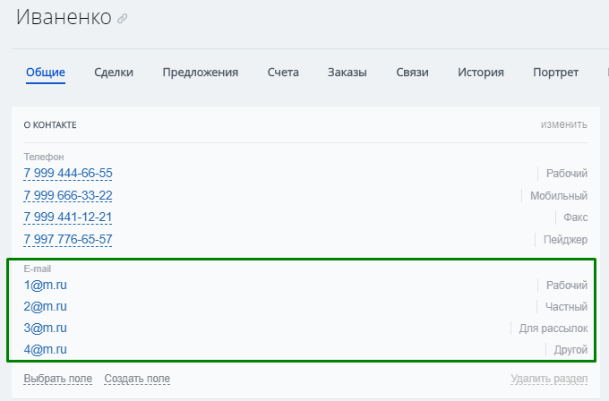 Если в Битрикс указать несколько email, они все синхронизируются в Логус и сохраняются в строчку через «;», но без указания типов (рабочий, частный и тд).