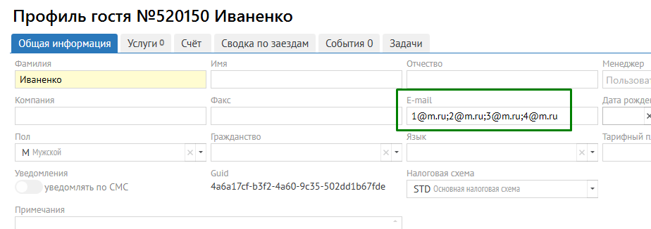 • False - если в контакте указано несколько email, профиль гостя в Логусе не создаётся, в логах записывается ошибка "Поле 'Электронная почта' не содержит допустимый адрес электронной почты"