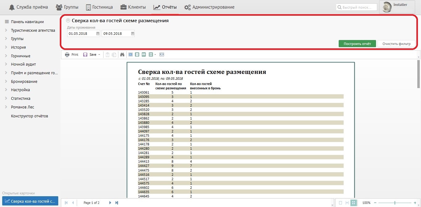 Сверка количества гостей схеме заселения - отчет, показывающий отношения количества гостей в схеме размещения в брони к количеству гостей, добавленных во вкладку "Гость", для занесения паспортных данных.
