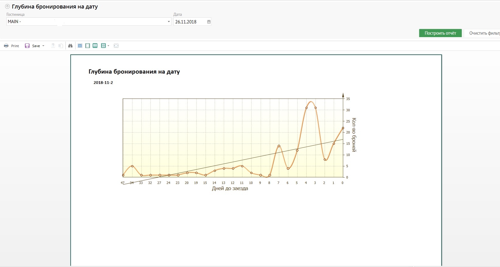 Глубина бронирования на дату - отчет, показывающих за какое количество дней до заезда была создана бронь:
