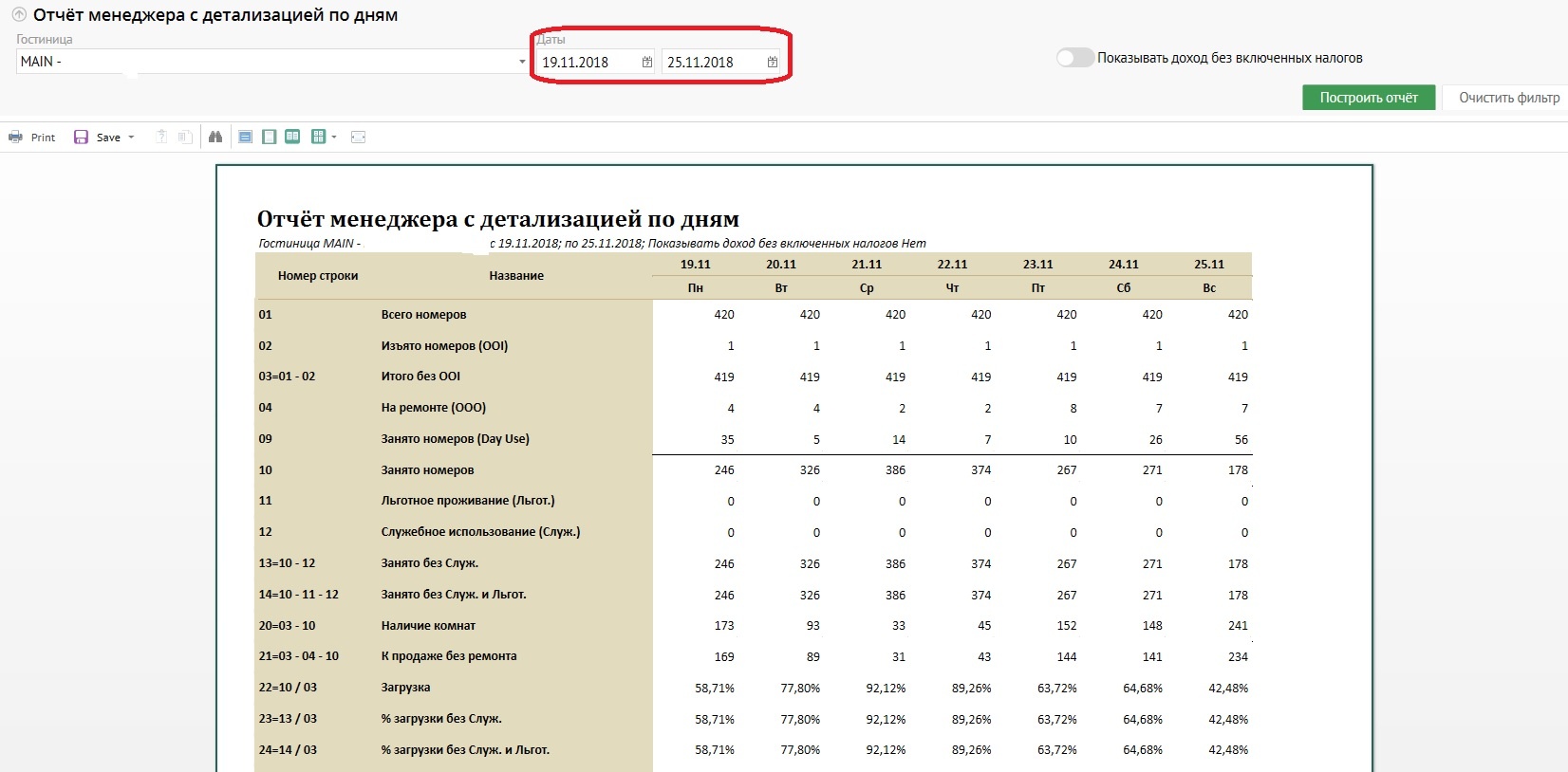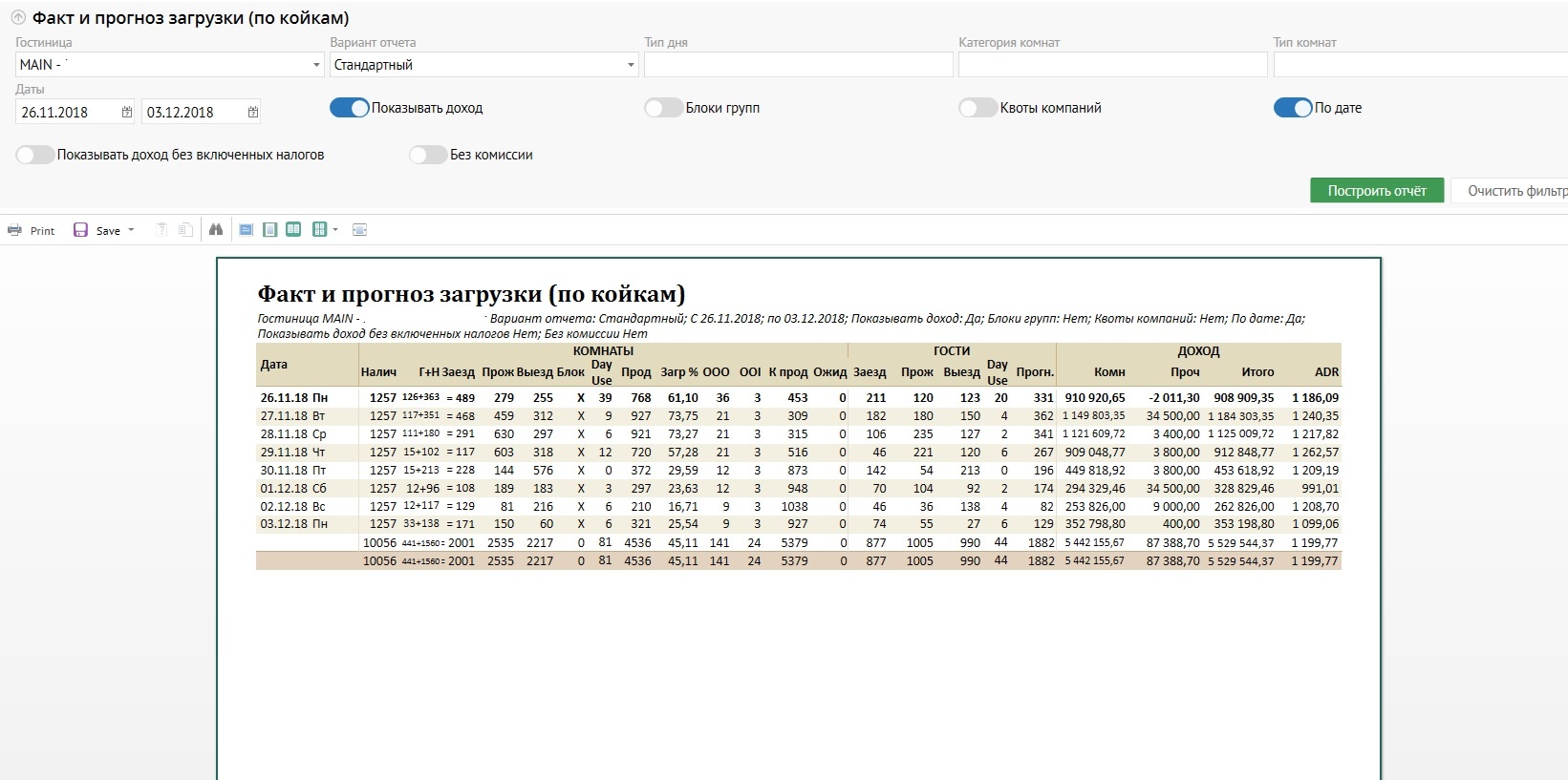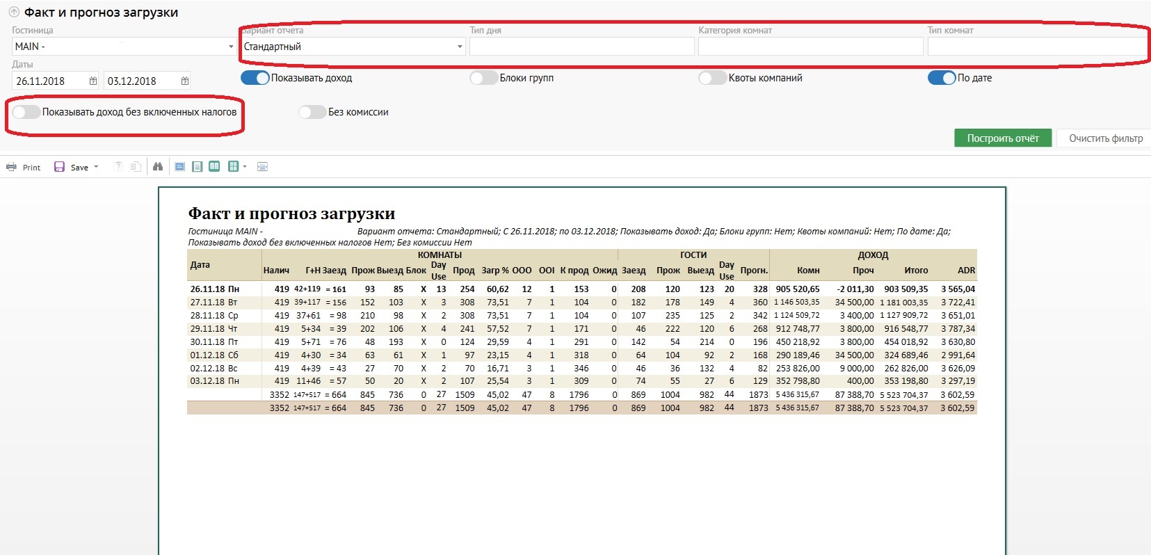 Факт и Прогноз Загрузки - один из самых важных отчётов, который используется для анализа статистических показателей отеля. Отличается от "Прогноза Загрузки" тем, что может работать в прошлое. Помимо фильтров по Варианту отчета, типу дня, категории и типам комнат, в последней версии отчета присутствует переключатель "Показывать доход без включенных доходов":