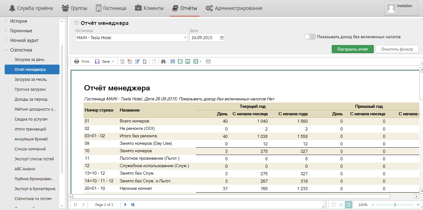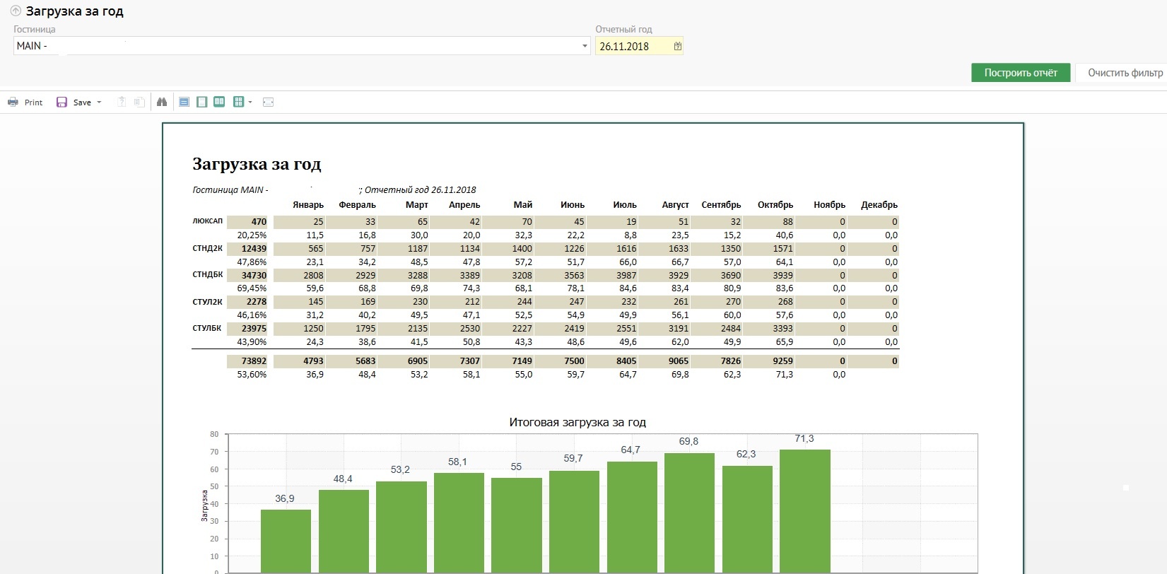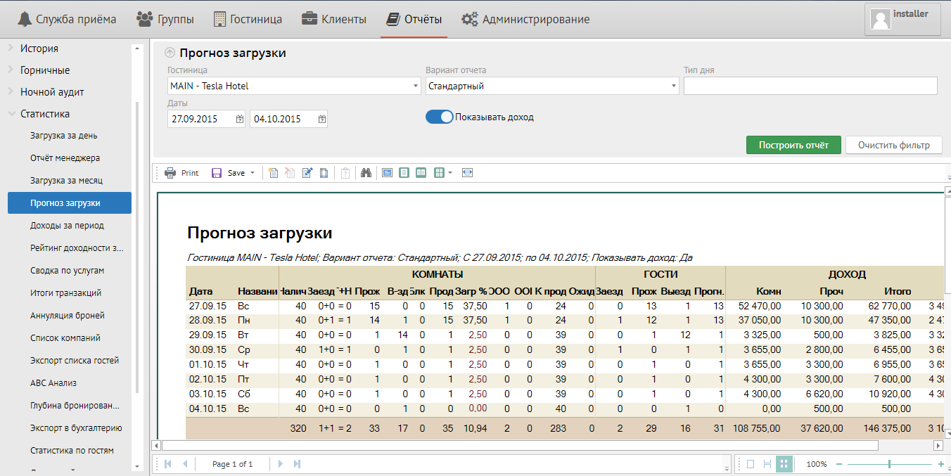 Факт и Прогноз Загрузки - один из самых важных отчётов, который используется для анализа статистических показателей отеля. Отличается от "Прогноза Загрузки" тем, что может работать в прошлое. Помимо фильтров по Варианту отчета, типу дня, категории и типам комнат, в последней версии отчета присутствует переключатель "Показывать доход без включенных доходов":