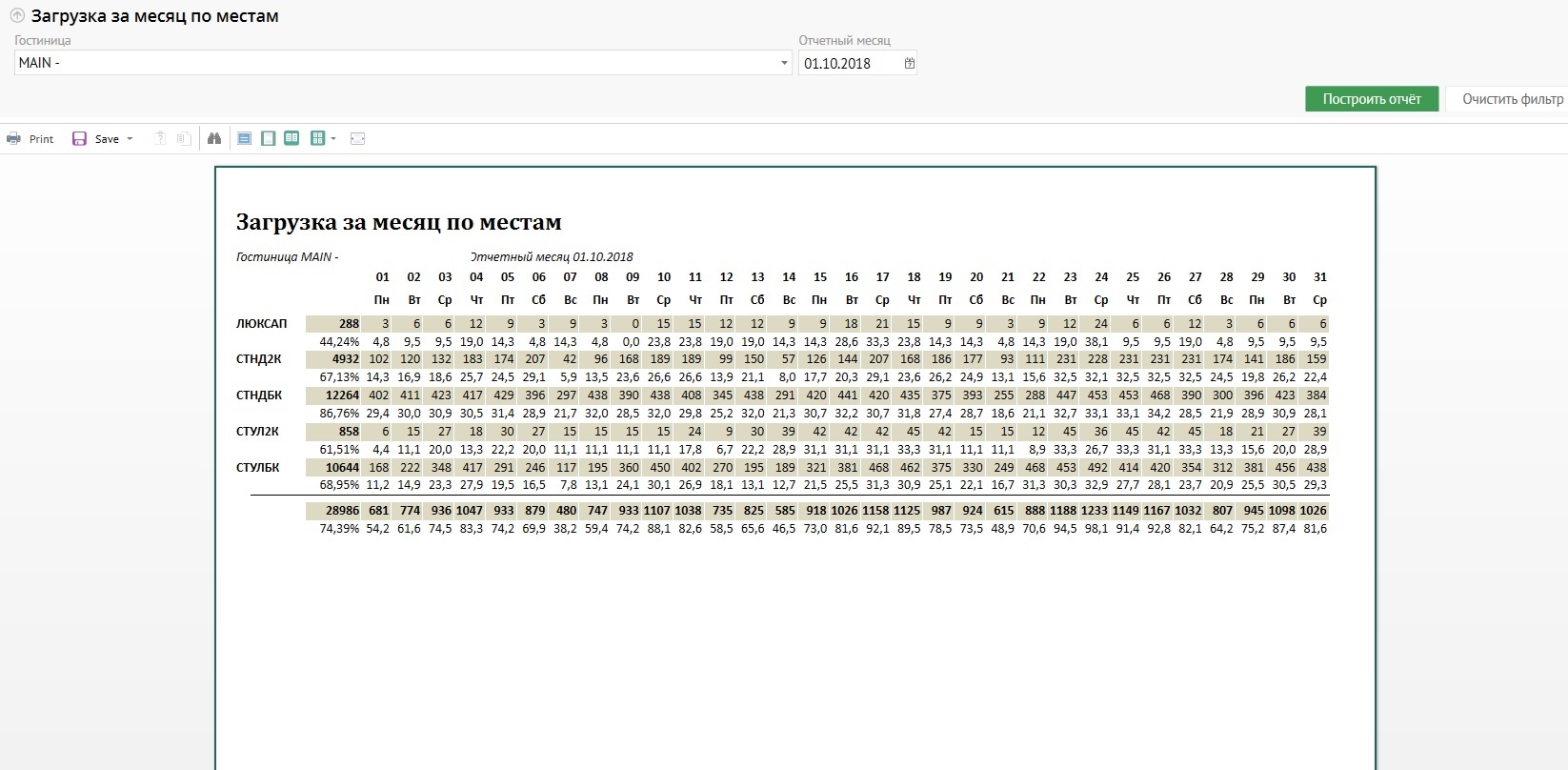 Глубина бронирования на дату - отчет, показывающий загрузку отеля в разрезе мест (коек). Внимание: отчет правильно работает только если настройка номерного фонда произведена в местах (то есть есть типы комнат "Многокомпонентный" и "Компонент"):