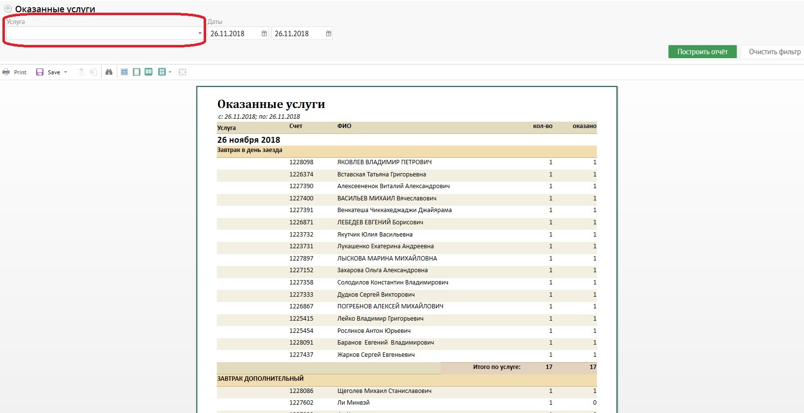 Оказанные услуги - отчет показывает, услуги, отпущенные через модуль Гостиница - Контроль Услуг. Услуги могут быть отпущены как через электронный ключ, так и вручную через строку "Быстрый отпуск по номеру комнаты или ключа". Для того, чтобы отпуск услуг заработал, необходимо в Администрирование - Точки продаж (POS) добавить точку отпуска и прописать её в настройке услуги (Администрирование - Услуги - Точка продаж) после чего в Контроле Услуг необходимо выбрать "Вид услуги" (+ в отчете есть фильтр по виду услуги):