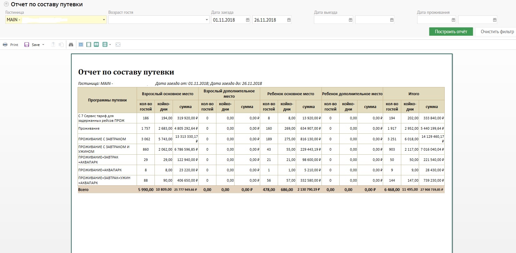 Отчет по составу путевки - отчет, созданный для медицинских объектов (санаториев) со столбцами по кол-ву гостей, койко-дней и суммами + с разделением на взрослых и детей: