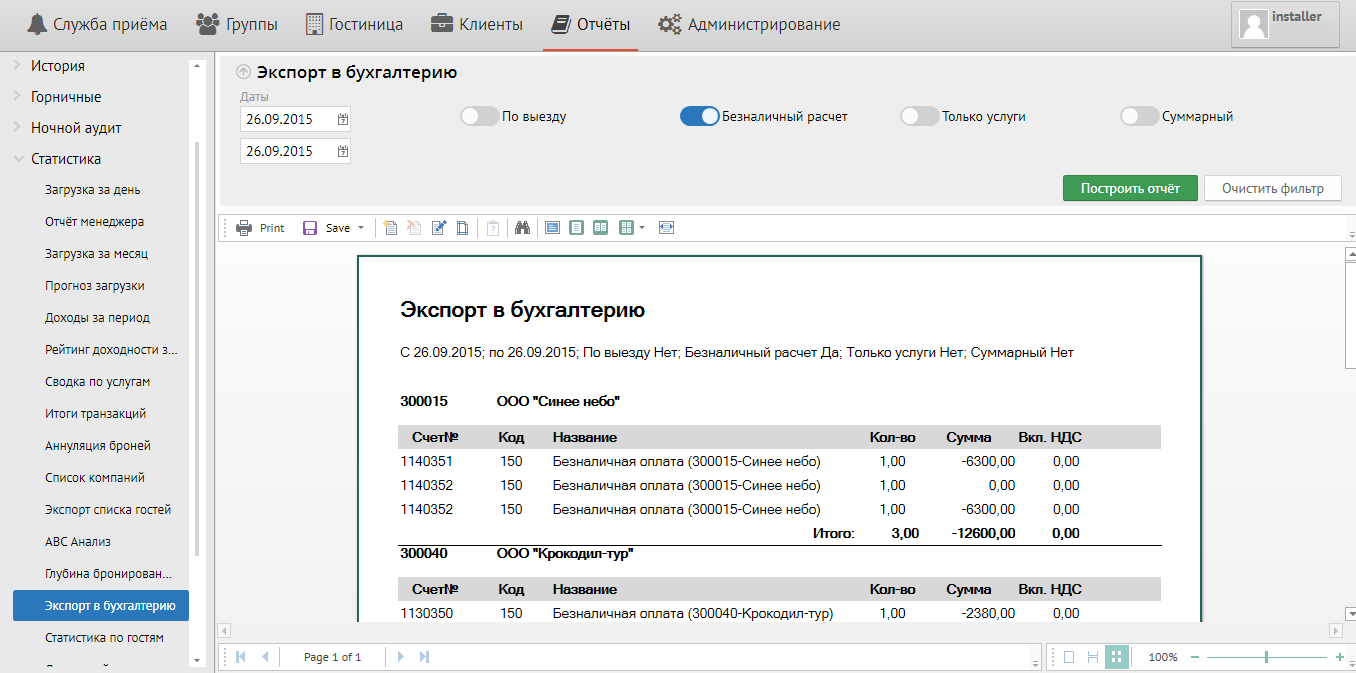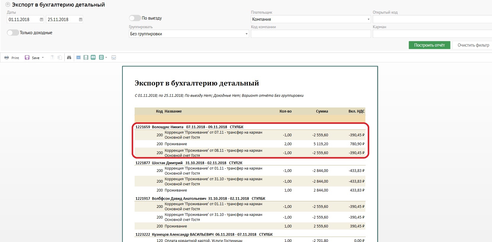 Экспорт в бухгалтерию детальный - отличается от "Экспорта в бухгалтерию" тем, что расписывает данные пофамильно + показывает начисления по каждой брони (ВНИМАНИЕ: отчет НЕ РАБОТАЕТ без интерфейса с 1С):