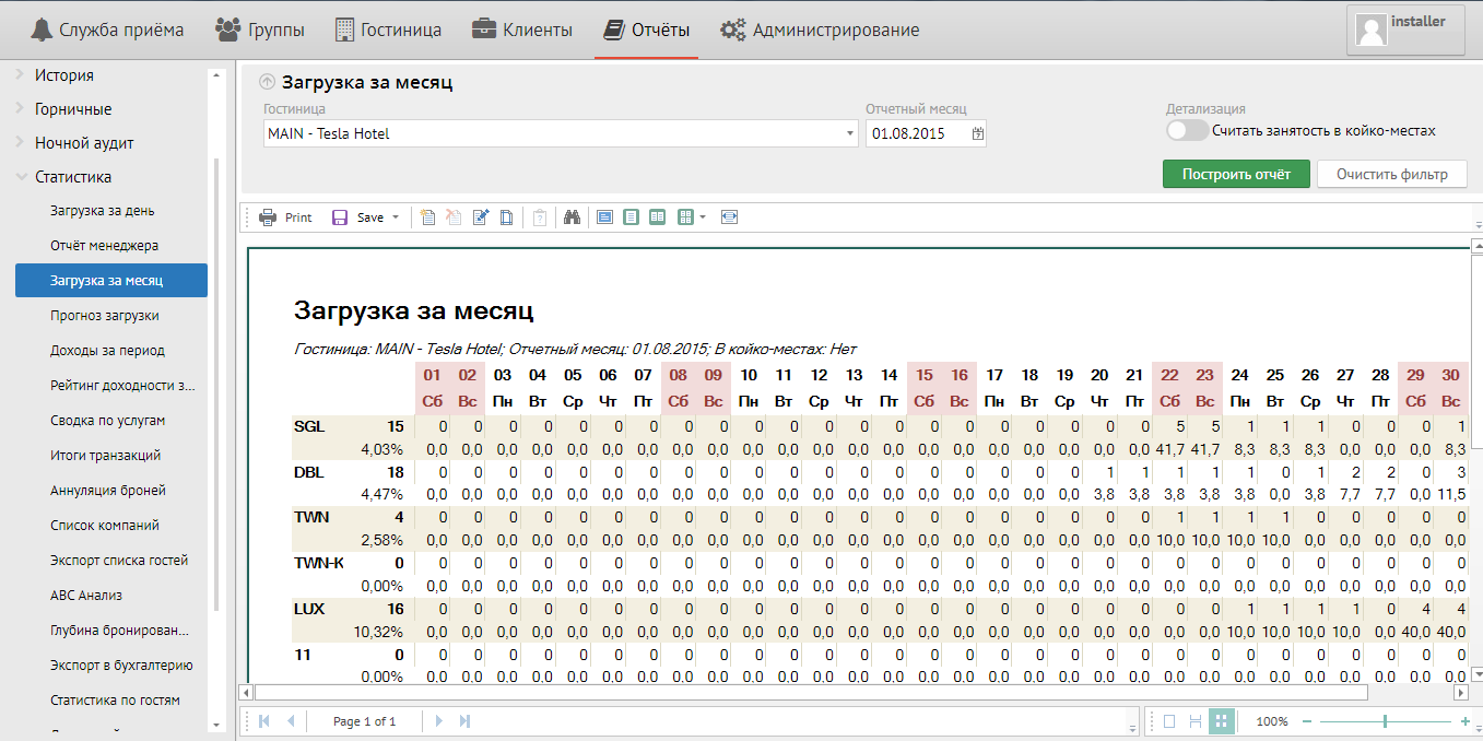 Загрузка за месяц - отчет, показывающий загрузку за месяц: