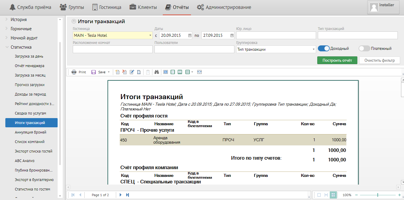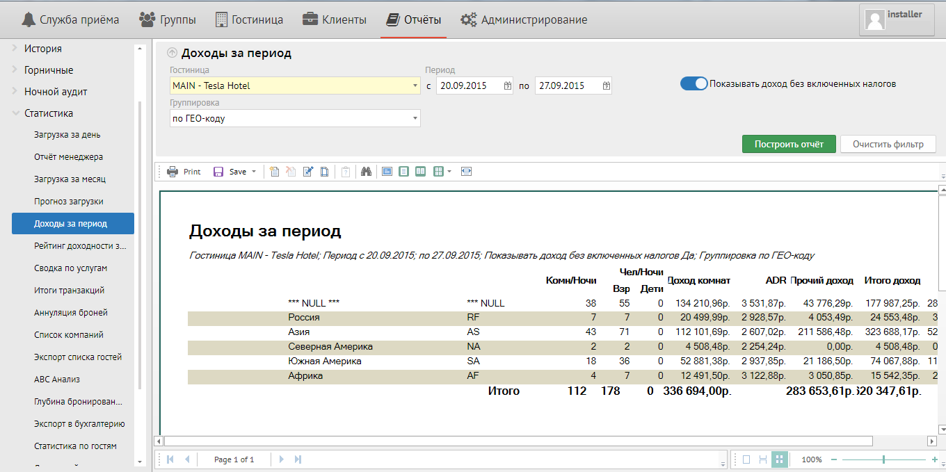 Доходы за период - сумма заработанных отелем денежных средств с различной группировкой: