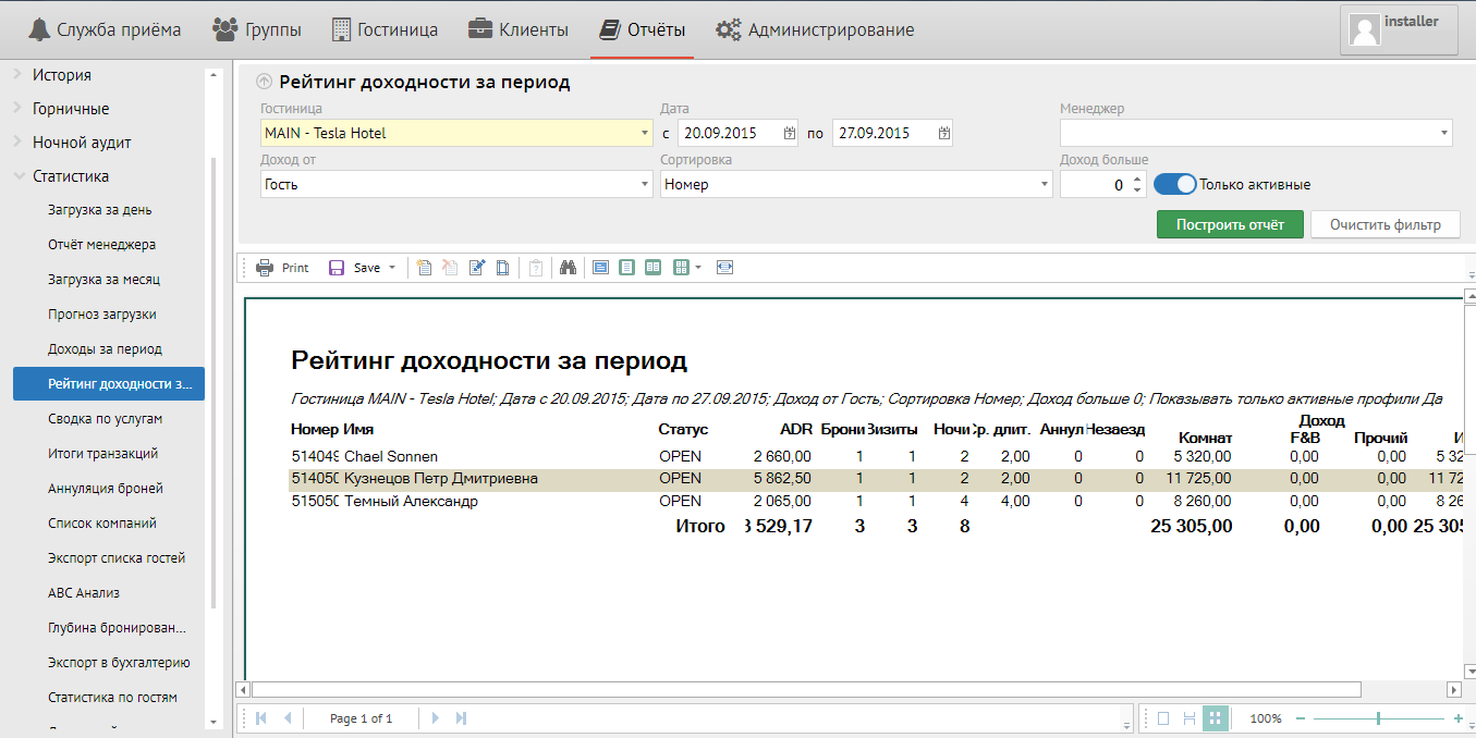 Рейтинг доходности за период - сумма доходов, визитов и т.д. (вся статистическая информация) по гостям: Фильтры: Дата "с .. по .." позволяет выбрать интересующий период времени для построения отчета. Фильтр "Менеджер" позволяет выбрать менеджера отеля (если заполнен в настройке компании) и посмотреть какой доход принес конкретный менеджер. Фильтр "Доход От" позволяет посмотреть доход, который принес либо гость, либо компания. Сортировка - порядок вывода на экран. "Доход больше" - возможность указать цифру от значения которой отчет покажет доходность. Переключатель "только активные" - показывать в отчете только активные профили (если не нажат переключатель, будет показывать все). Колонки отчета: Номер - № брони. Имя - Имя гостя/компании. Статус - Активный/Неактивный профиль. ADR - средний отпускной тариф. Брони - количество броней. Визиты - количество визитов. Ночи - количество ночей. Ср. длит - средняя длительность проживания. Аннул - количество аннуляций. Незаезд - количество незаездов. Доход: Комнат - доход от проживания. F&B - доход от еды. Прочий - весь остальной доход. Итого - общая цифра.
