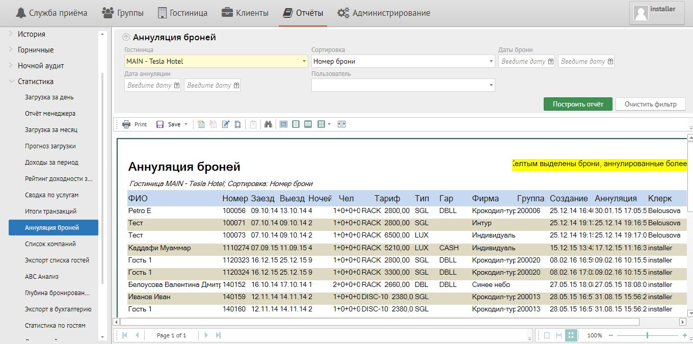 Аннуляция броней - отчет, показывающий количество аннулированных броней: