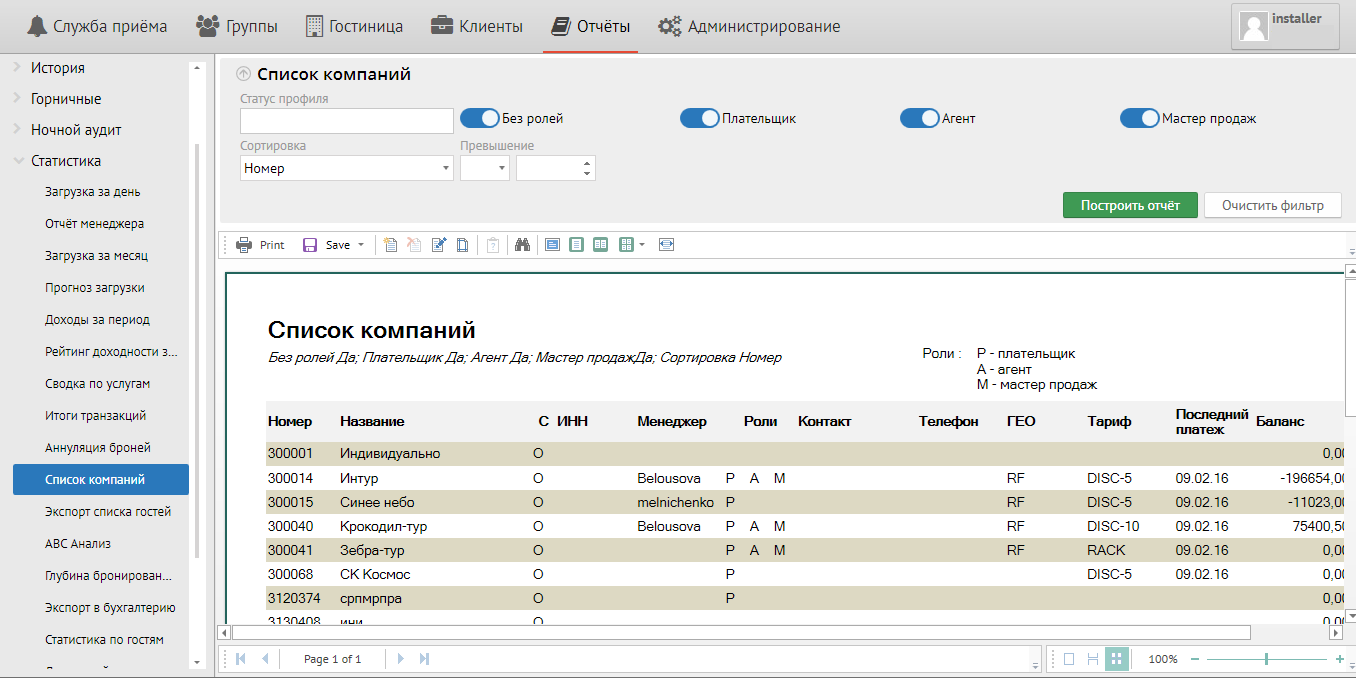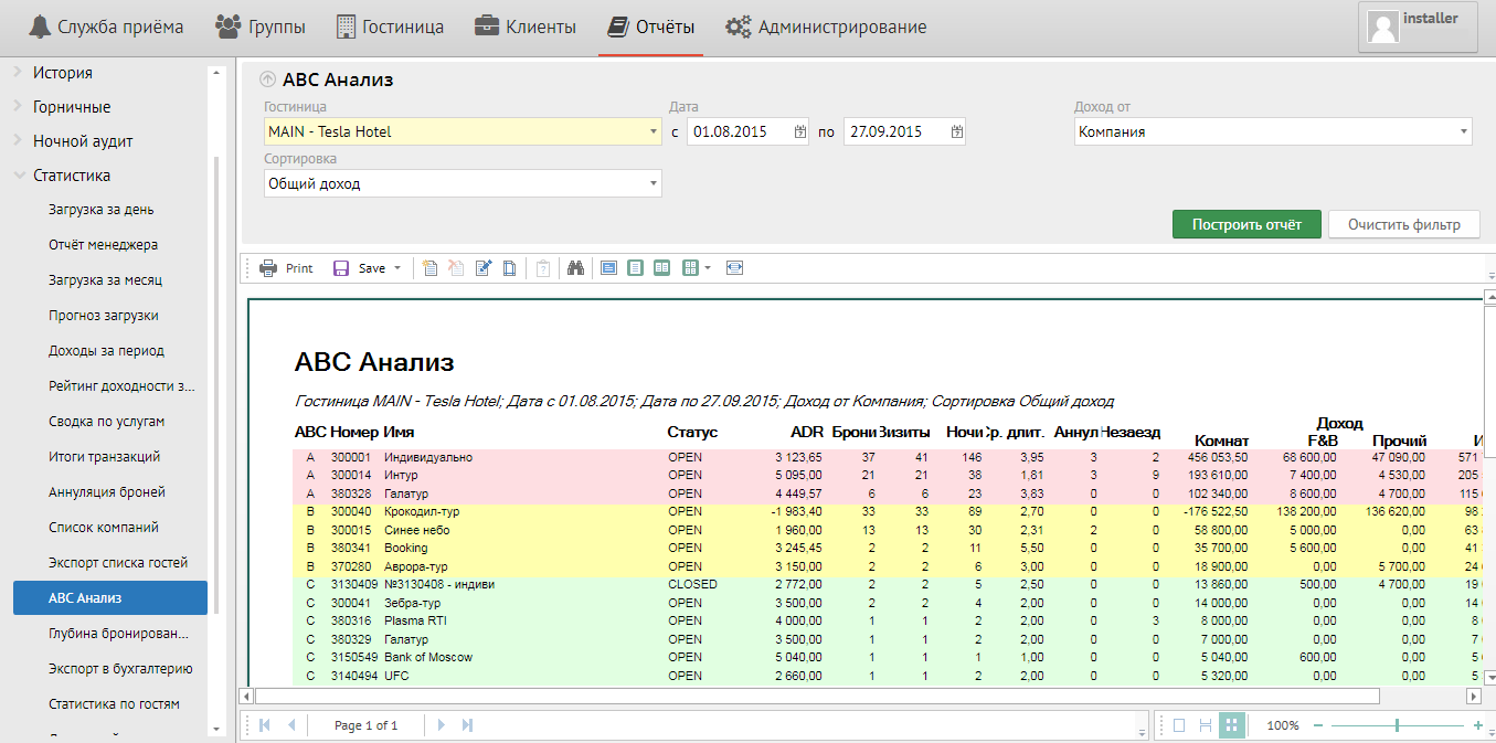 ABC анализ - отчет, показывающий компании по убыванию (от самой дорогой до самой дешевой) с бронями, ночами, доходом и т.д. (вся статистическая информация):