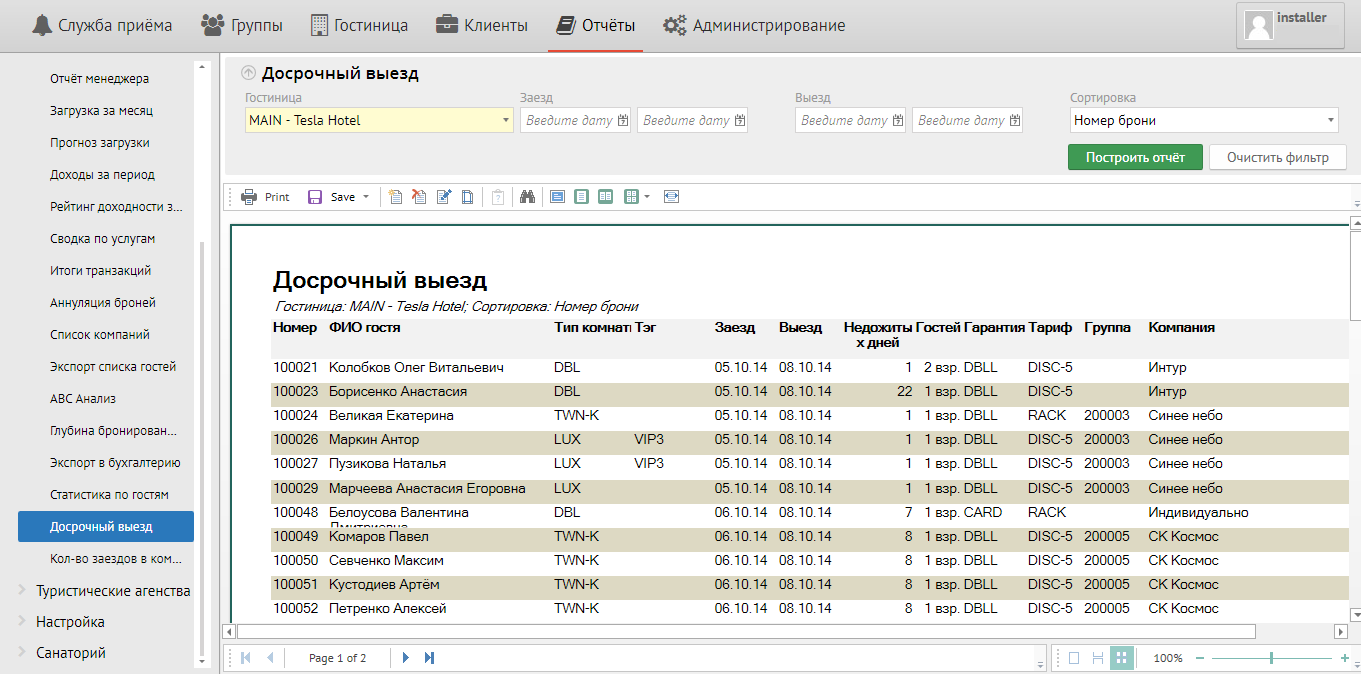 Досрочный выезд - отчет, показывающих гостей, уехавших досрочно: