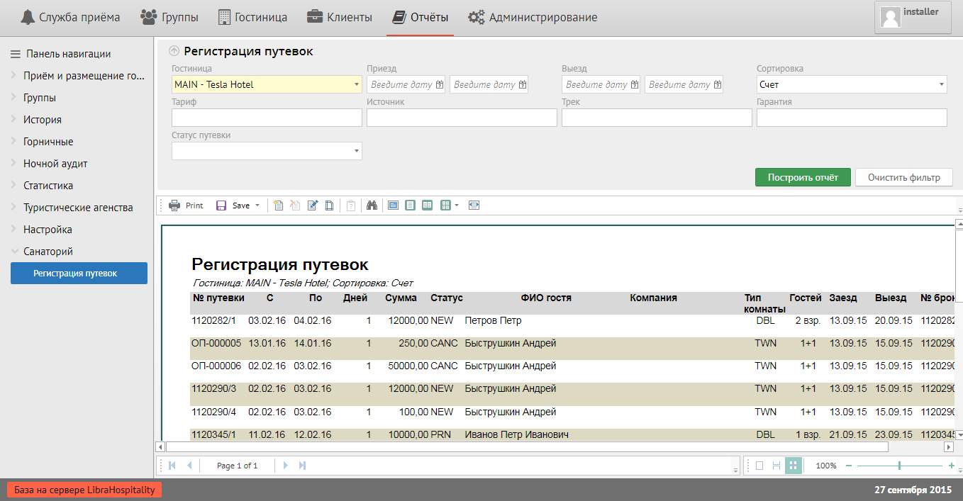Регистрация путевок - отчет для тех объектов, которые пользуются путевками (санатории и т.д.). Показывает сумму путевки, № путевки, компанию и гостя:
