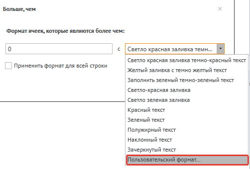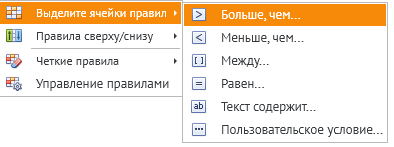 При выборе Пользовательских условий в Условном форматировании появляется возможность настроить более точные условия выборки.
