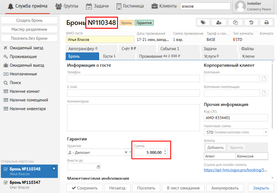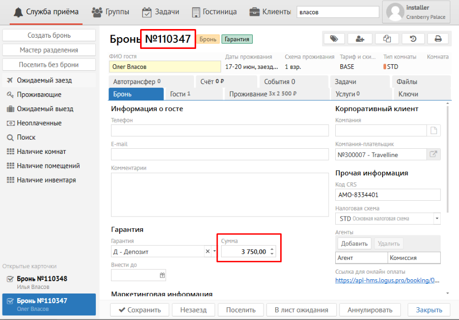 Вставив данную ссылку в браузер, откроется страница с кратким описанием брони и суммой оплаты. Сумма оплаты определяется гарантией, указанной при бронировании.