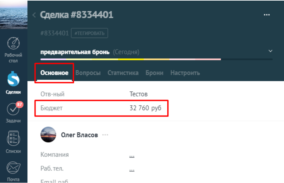 На вкладке "Основное" в поле "Бюджет" отображается полная стоимость всех не аннулированных броней, находящихся в сделке.