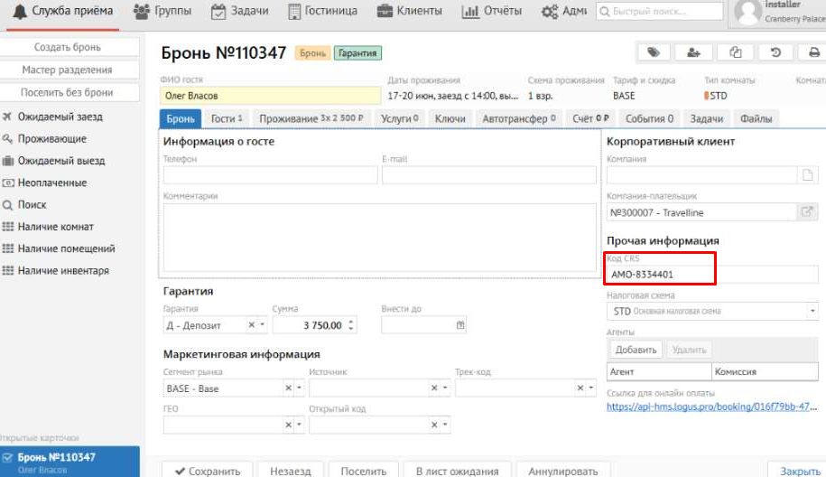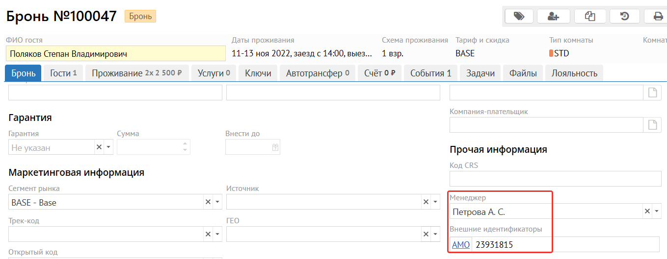 С версии 3.35.1 реализована возможность передавать в АМО CRM данные гостя (ФИО, телефон, e-mail) непосредственно из карточки брони, без привязки к профилю гостя. Это позволяет работать с гостями, у которых еще не создан профиль в системе.