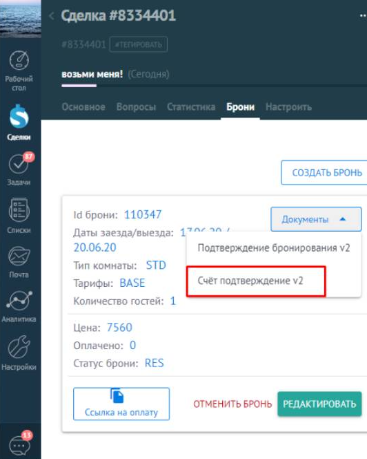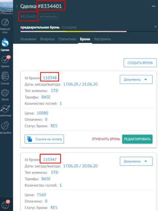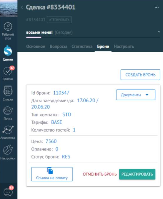 Работа со сделкой и бронью