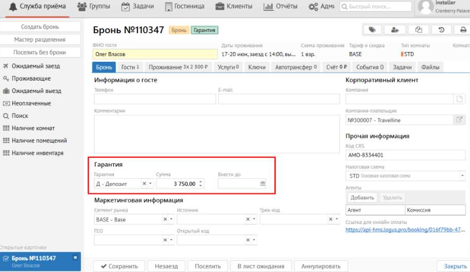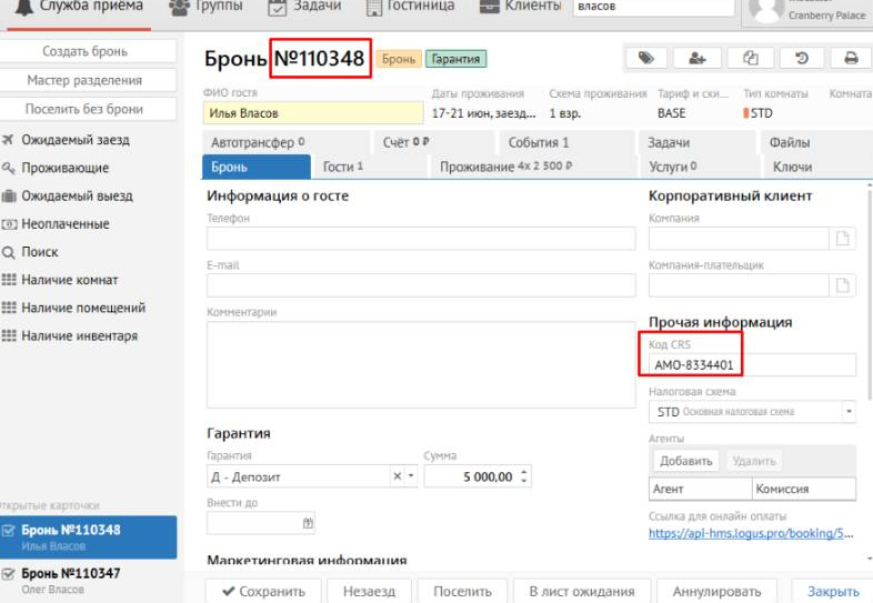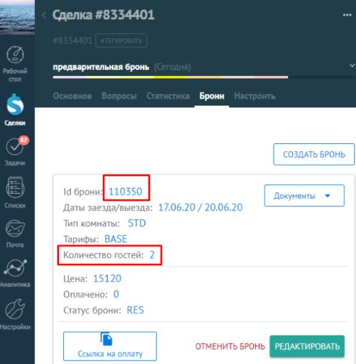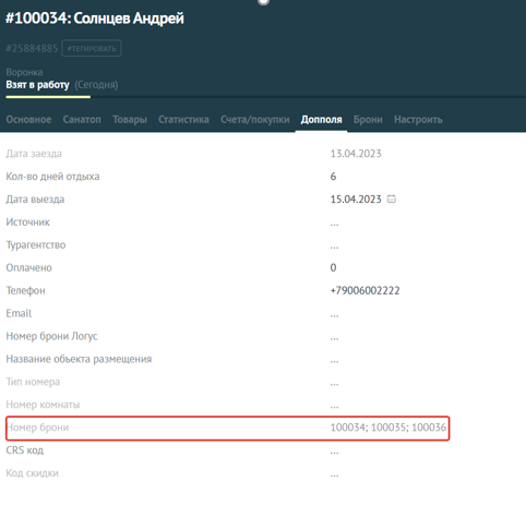 После указания параметров проживания и нажатия "Сохранить бронь", в Логусе создаётся бронь, а на вкладке  в АМО появляется основная информация о брони.