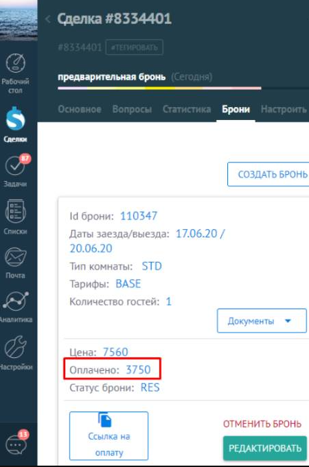 • Оплачено - сумма оплат по всем броням в сделке.