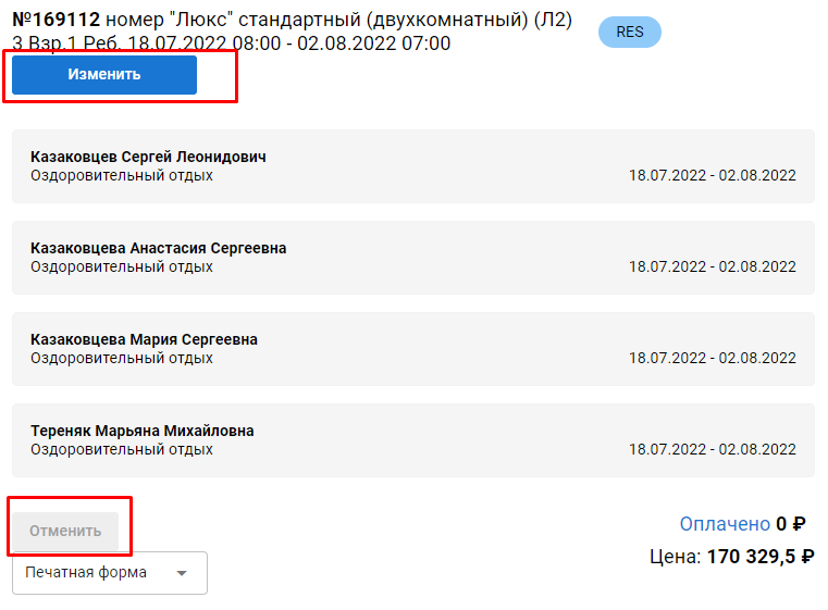 Редактирование и отмена брони