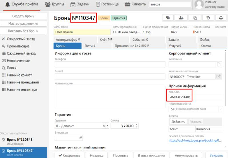 • CRS код - номер внешнего идентификатора (например номер заявки Travelline)