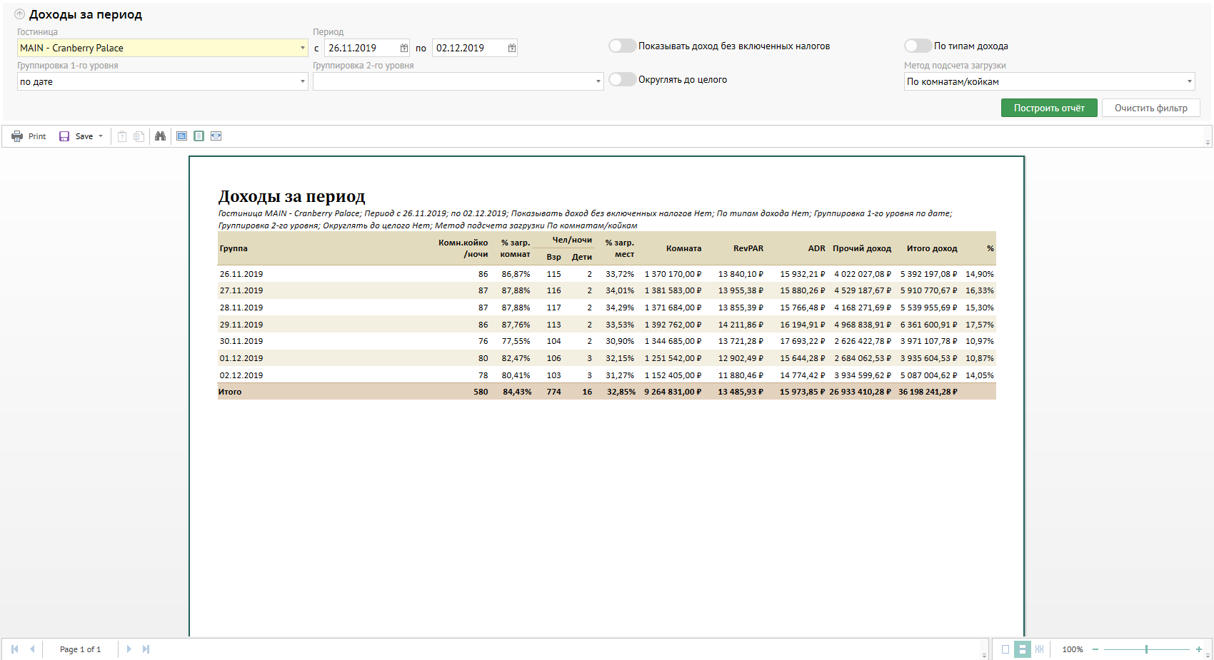 Фильтры и группировка | Гостиница: объект, по данным которого будет строиться отчет Период: отчетный период (дата проживания брони, либо дата транзакции) [неделя назад - вчера относительно даты объекта] Показывать доход без включенных налогов: если включен - столбцы с финансовой информацией не учитывают сумму налогов [включен по-умолчанию] По типам доходов: если включен - колонка Прочий доход разворачивается в колонки по типам доходов [выключен по-умолчанию] Группировка 1-го уровня: выбор варианта группировки 1-го уровня информации в отчете