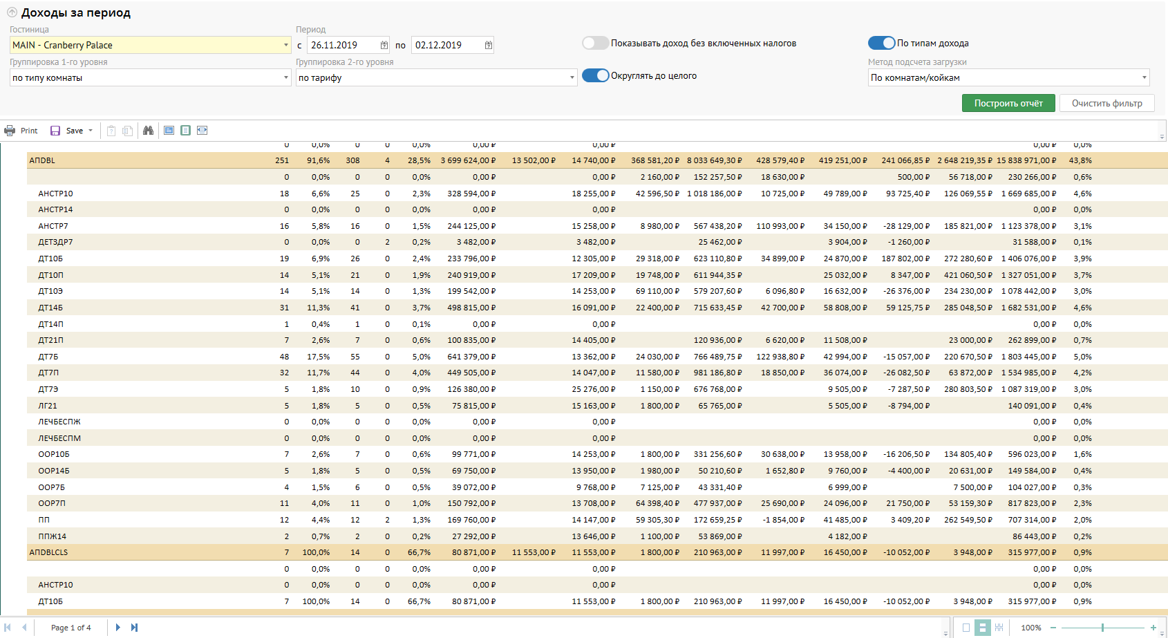 Столбцы | Группа: код или наименование группы в зависимости от выбранных вариантов 1-го и 2-го уровней группировки Комн/ночи: количество комнат/коек, занятых в отчетный день. % загр комнат: загрузка комнат/коек за отчетный день. Чел/ночи / Взр: количество взрослых гостей из схемы размещения за отчетный день, за вычетом категорий гостей без места (признак у категории гостей в свойствах объекта) Чел/ночи / Дети: количество гостей-детей из схемы размещения за отчетный день, за вычетом категорий гостей без места (признак у категории гостей в свойствах объекта) % загр мест: отношение количества гостей к общему количеству мест/коек по данной группе, при этом количество гостей считается за вычетом категорий гостей без места (признак у категории гостей в свойствах объекта), а также количество гостей при расчете данной колонки ограничивается сверху количеством основных мест по типам номеров за отчетный период. То есть, загрузка не может быть Комната (название данной колонки зависит от названия типа дохода проживания в справочнике): сумма доходов за проживание за отчетный период RevPAR: отношение доходов за проживание к количеству номеров/мест в наличии. То есть, тут вычисляется доход от одного номера/места. ADR: отношение доходов за проживание к количеству занятых номеров/мест в наличии. То есть, тут вычисляется доход от одного занятого номера/места. Прочий доход: сумма доходов кроме проживания за отчетный период. При включении фильтра По типам доходов данная колонка раскладывается в набор колонок по типам доходов Итого доход: сумма всех доходов за отчетный период %: отношение Итого доходов по строке к Итого доходов всего за отчетный период. Иначе говоря, доля доходов по строке в общей сумме доходов. |
