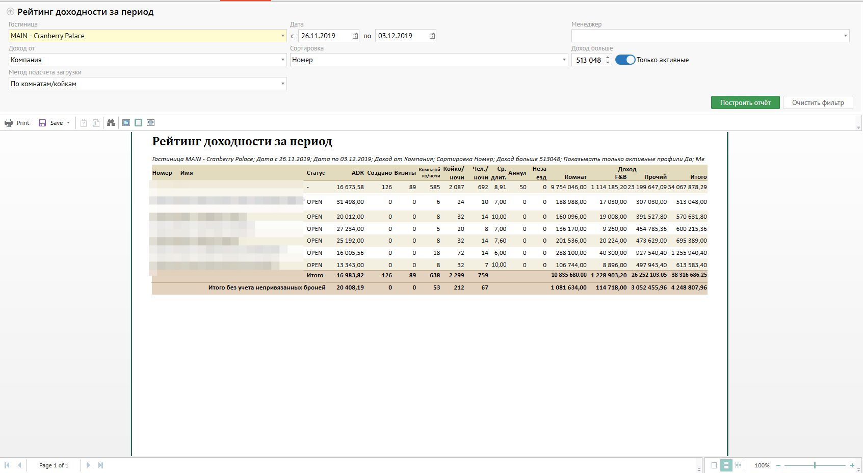 Описание | В отчете выводится информация о доходах, количестве броней и гостей в группировке по профилям, чей тип выбран в фильтре "Доход от" |