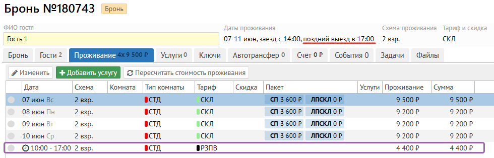 2. Если продолжительность контракта выходит за стандартное время выезда объекта, в бронях этого контракта получаем поздний выезд и в стоимость контракта включается соответственно стоимость этого позднего выезда. Но при расчете стоимости проживания за день по этому контракту в силу сложности вычислений, пренебрегаем тем, что существует такой отрезок позднего выезда и просто делим сумму по контракту на количество дней действия контракта. Из-за этого можем получить расхождение в стоимости дня проживания по контракту и стоимости дня проживания по брони.