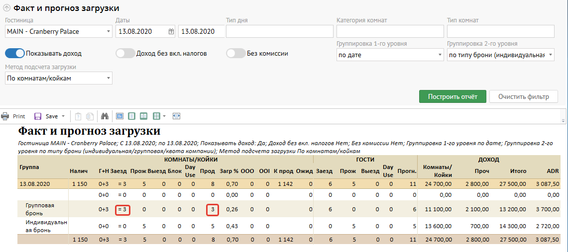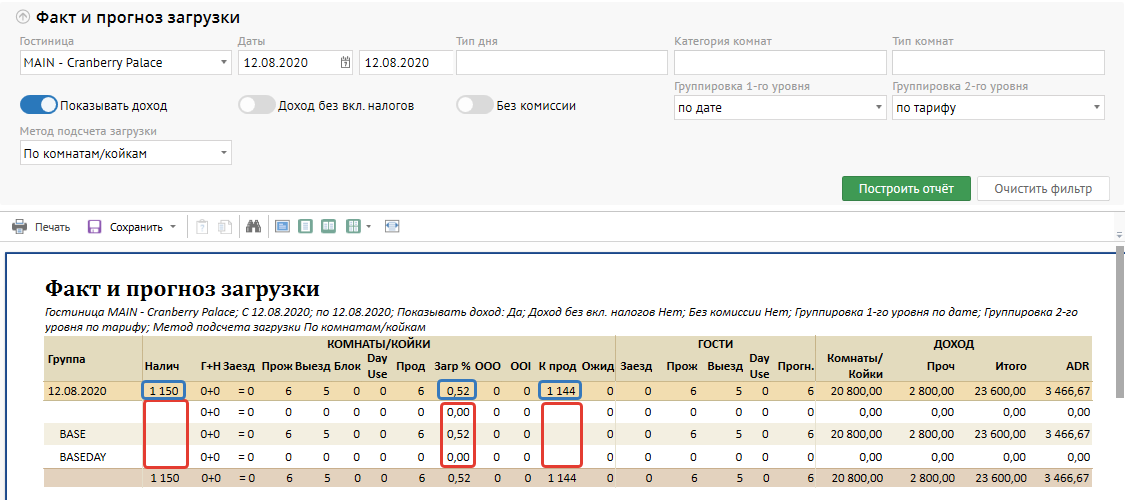 На примере отчета Факт и прогноз загрузки можно рассмотреть как будут выведены данные в блоке КОМНАТЫ: Налич, Загр %, К прод при различных вариантах двух видов группировки.