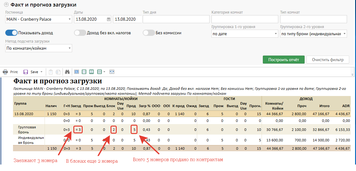 - Если индивидуальные брони созданы не по всем контактам, то количество занятых комнат считаем по количеству комнат инд.броней + количество комнат по контрактам без броней;