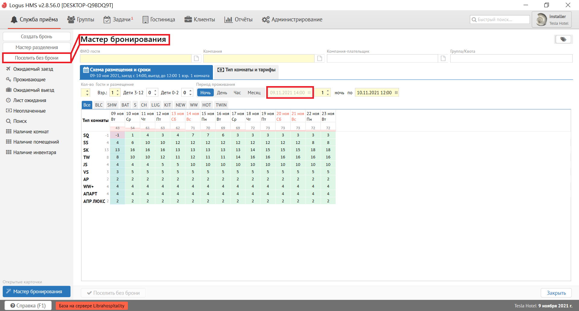 Для размещения гостей без предварительного бронирования в ПО Logus используется функция "Поселить без брони" (кнопка на панели управления слева).