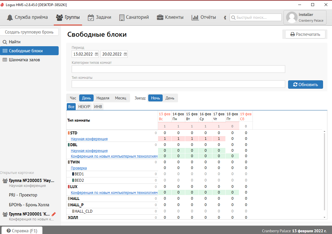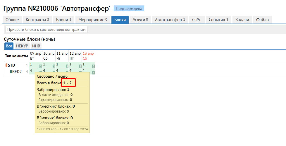 Из-за разницы алгоритмов расчета номеров в блоке для таблицы наличия и для внешнего канала, при наличии диапазона наличия, в Групповой брони, на вкладке Блоки, на вкладке Свободные блоки и в Квотах выводится информация в формате диапазона(от минимального количества номеров на эту дату до максимального):