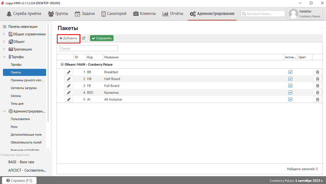 Пакеты позволяют преднастраивать набор услуг, который затем можно легко применять к броням. Для того, чтобы добавить новый пакет, необходимо зайти в справочник "Пакеты" и нажать "Добавить":